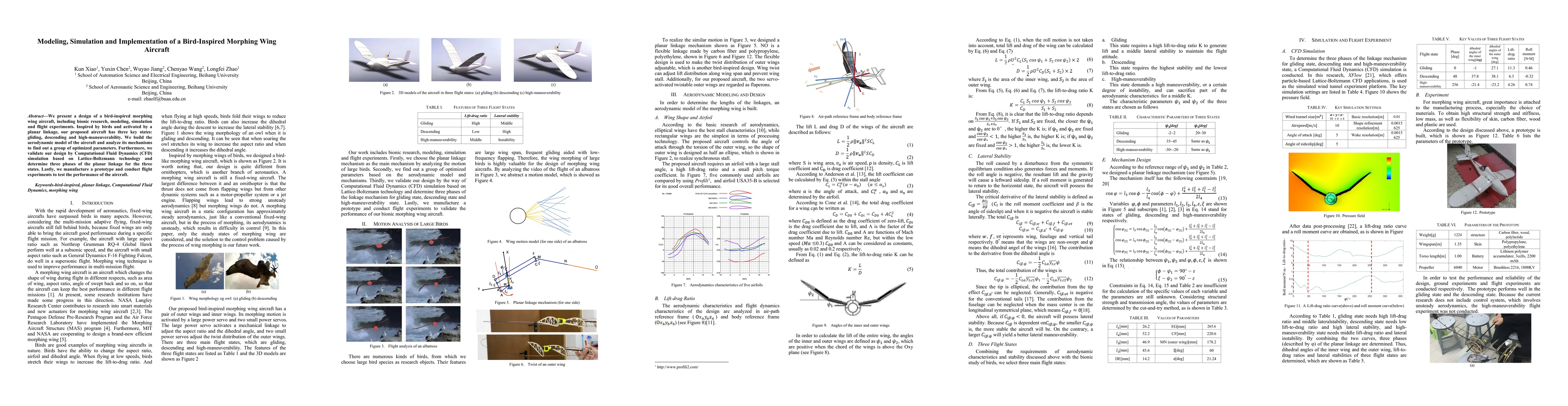 This paper designs a bird-inspired morphing wing aircraft with three operational states: gliding, descending, and high-maneuverability. The study employs aerodynamic modeling, CFD simulation, and flight experiments to validate the aircraft's performance and optimize its parameters.