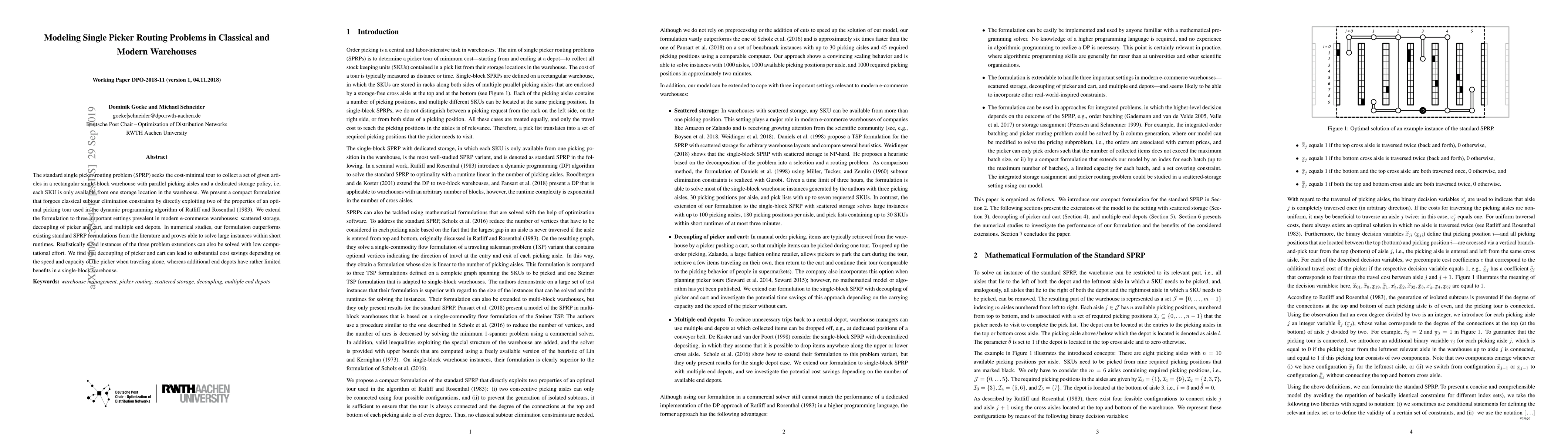This paper presents a new compact formulation for the single picker routing problem (SPRP) in warehouses, avoiding classical constraints and extending to modern settings like scattered storage and decoupling of picker and cart. The new model outperforms existing formulations and shows significant cost savings from picker-cart decoupling.