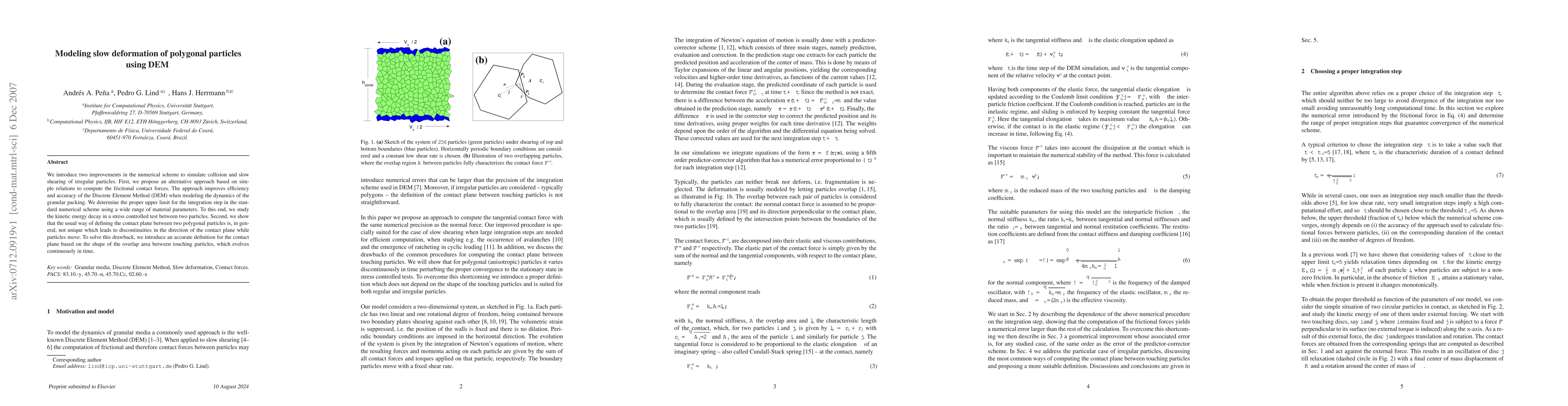 We introduce two improvements in the numerical scheme to simulate collision and slow shearing of irregular particles. First, we propose an alternative approach based on simple relations to compute the frictional contact forces. The approach improves efficiency and accuracy of the Discrete Element Method (DEM) when modeling the dynamics of the granular packing. We determine the proper upper limit for the integration step in the standard numerical scheme using a wide range of material parameters. To this end, we study the kinetic energy decay in a stress controlled test between two particles. Second, we show that the usual way of defining the contact plane between two polygonal particles is, in general, not unique which leads to discontinuities in the direction of the contact plane while particles move. To solve this drawback, we introduce an accurate definition for the contact plane based on the shape of the overlap area between touching particles, which evolves continuously in time.