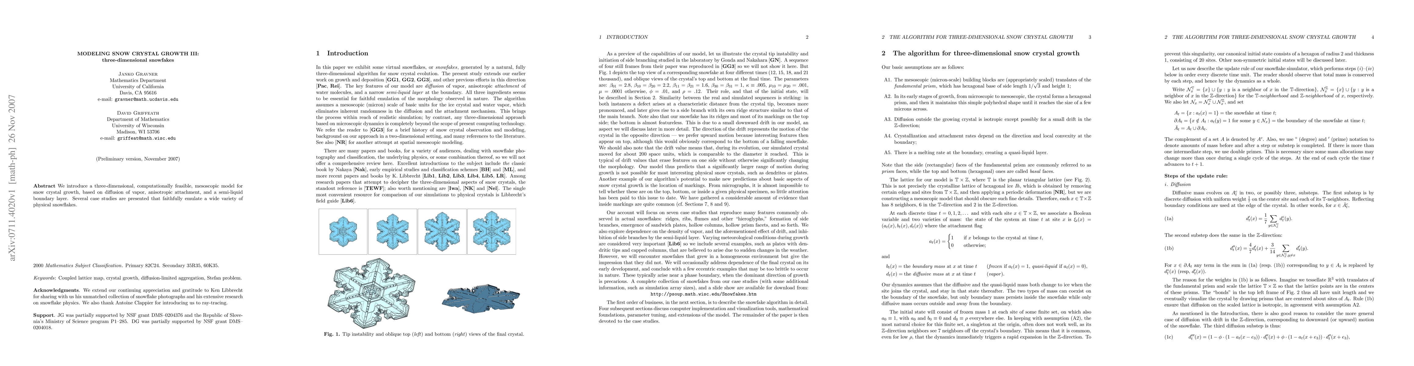 Researchers developed a 3D model for snow crystal growth that accurately simulates various types of snowflakes using diffusion, attachment, and boundary layer physics.