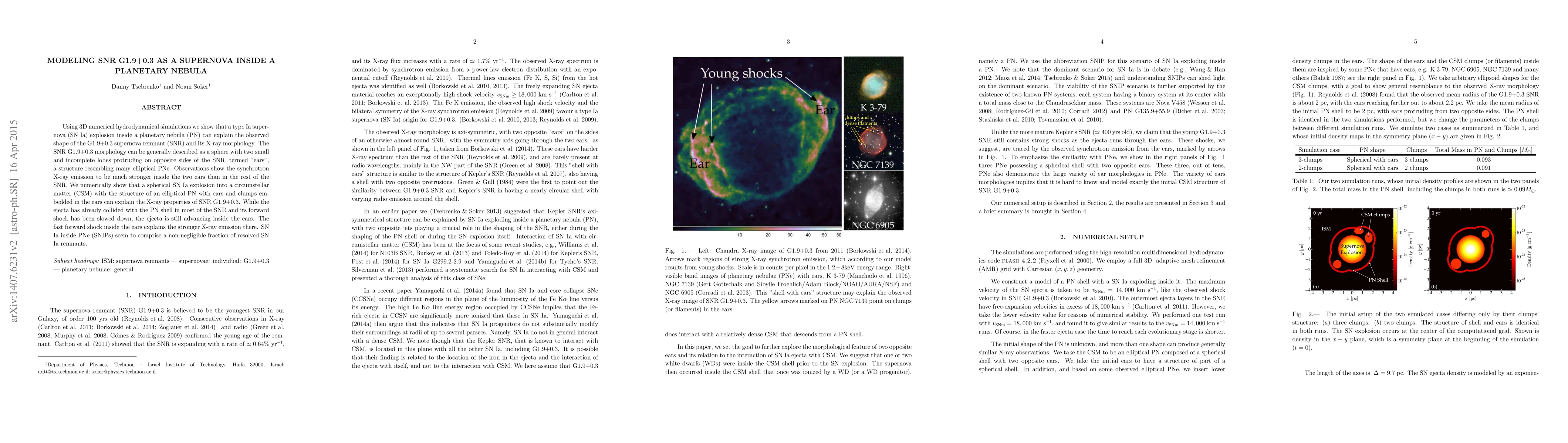 This paper uses 3D simulations to demonstrate that a type Ia supernova within a planetary nebula can explain the unique shape and X-ray morphology of the G1.9+0.3 supernova remnant, showing stronger X-ray emission in its "ears" due to a fast forward shock.