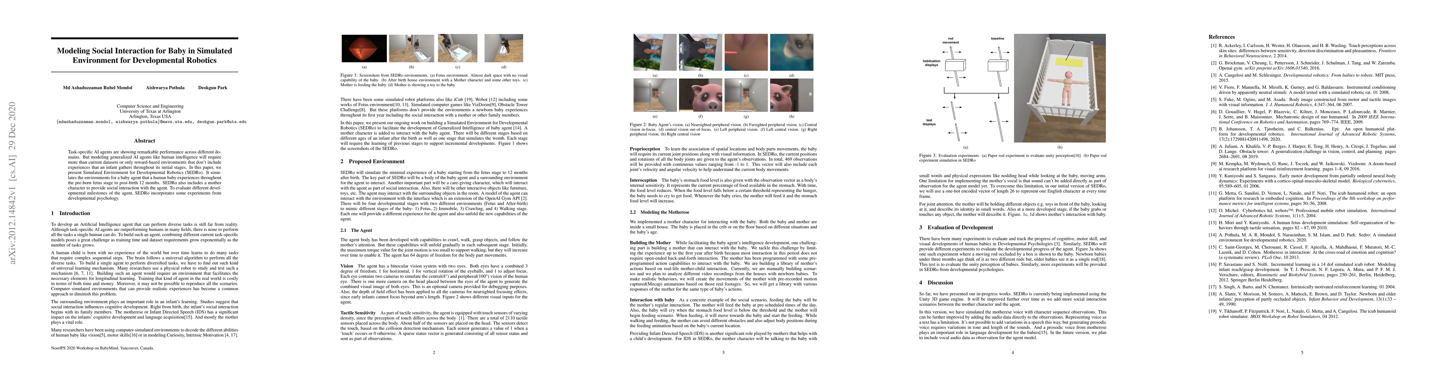 This paper introduces SEDRo, a simulated environment for developmental robotics that models a baby's experiences from prenatal stages to 12 months post-birth, including social interactions with a mother character. The environment aims to better model generalized AI agents by incorporating developmental psychology experiments to evaluate milestones.