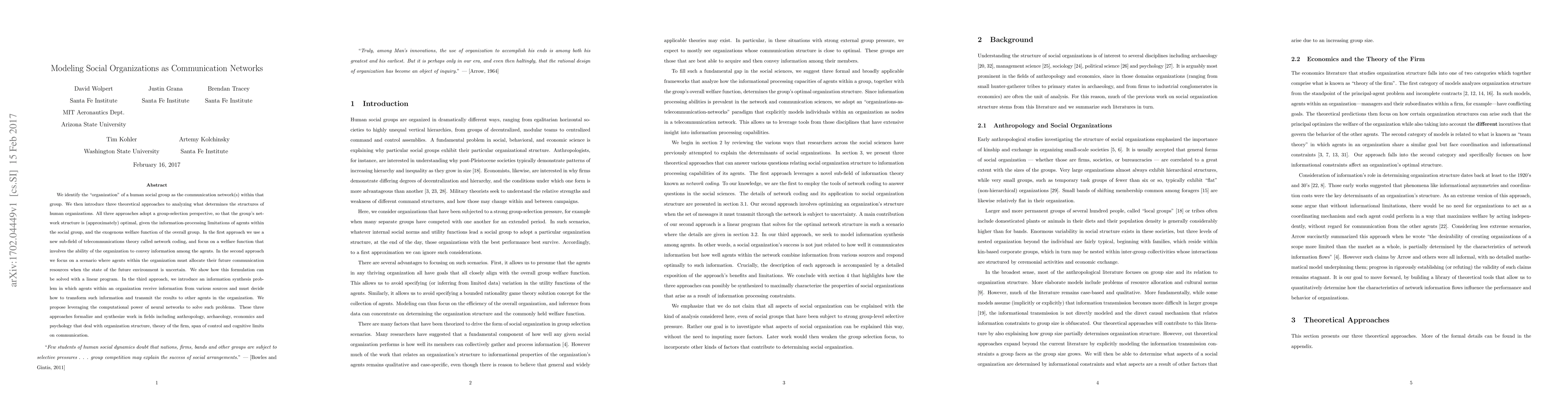 We identify the "organization" of a human social group as the communication network(s) within that group. We then introduce three theoretical approaches to analyzing what determines the structures of human organizations. All three approaches adopt a group-selection perspective, so that the group's network structure is (approximately) optimal, given the information-processing limitations of agents within the social group, and the exogenous welfare function of the overall group. In the first approach we use a new sub-field of telecommunications theory called network coding, and focus on a welfare function that involves the ability of the organization to convey information among the agents. In the second approach we focus on a scenario where agents within the organization must allocate their future communication resources when the state of the future environment is uncertain. We show how this formulation can be solved with a linear program. In the third approach, we introduce an information synthesis problem in which agents within an organization receive information from various sources and must decide how to transform such information and transmit the results to other agents in the organization. We propose leveraging the computational power of neural networks to solve such problems. These three approaches formalize and synthesize work in fields including anthropology, archeology, economics and psychology that deal with organization structure, theory of the firm, span of control and cognitive limits on communication.