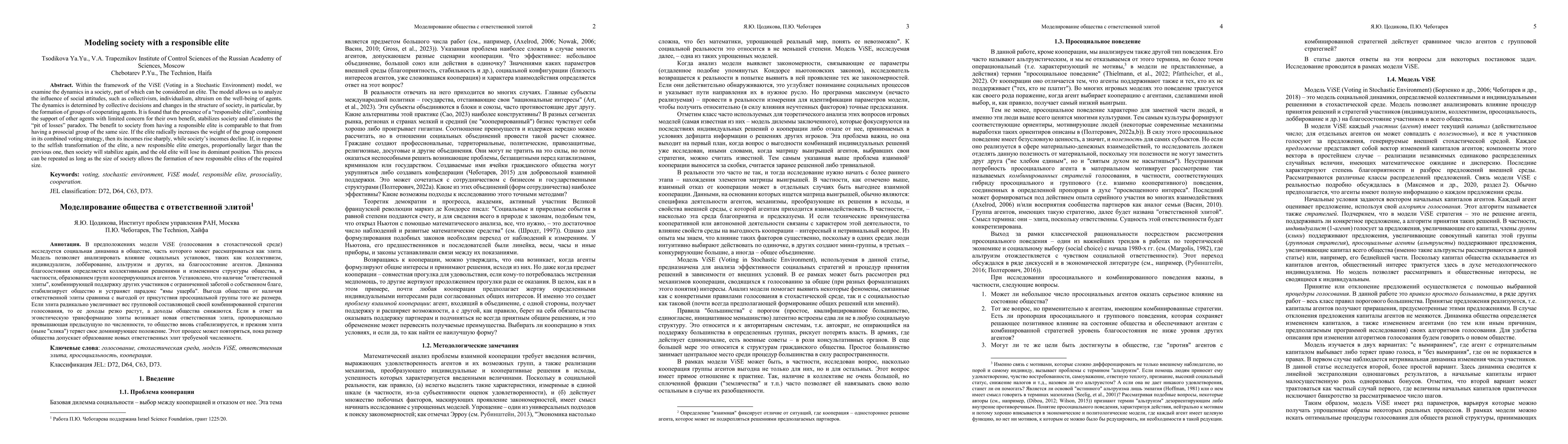 Within the framework of the ViSE (Voting in a Stochastic Environment) model, we examine the dynamics in a society, part of which can be considered an elite. The model allows us to analyze the influence of social attitudes, such as collectivism, individualism, altruism on the well-being of agents. The dynamics is determined by collective decisions and changes in the structure of society, in particular, by the formation of groups of cooperating agents. It is found that the presence of a "responsible elite", combining the support of other agents with limited concern for their own benefit, stabilizes society and eliminates the "pit of losses" paradox. The benefit to society from having a responsible elite is comparable to that from having a prosocial group of the same size. If the elite radically increases the weight of the group component in its combined voting strategy, then its incomes rise sharply, while society's incomes decline. If, in response to the selfish transformation of the elite, a new responsible elite emerges, proportionally larger than the previous one, then society will stabilize again, and the old elite will lose its dominant position. This process can be repeated as long as the size of society allows the formation of new responsible elites of the required size.
