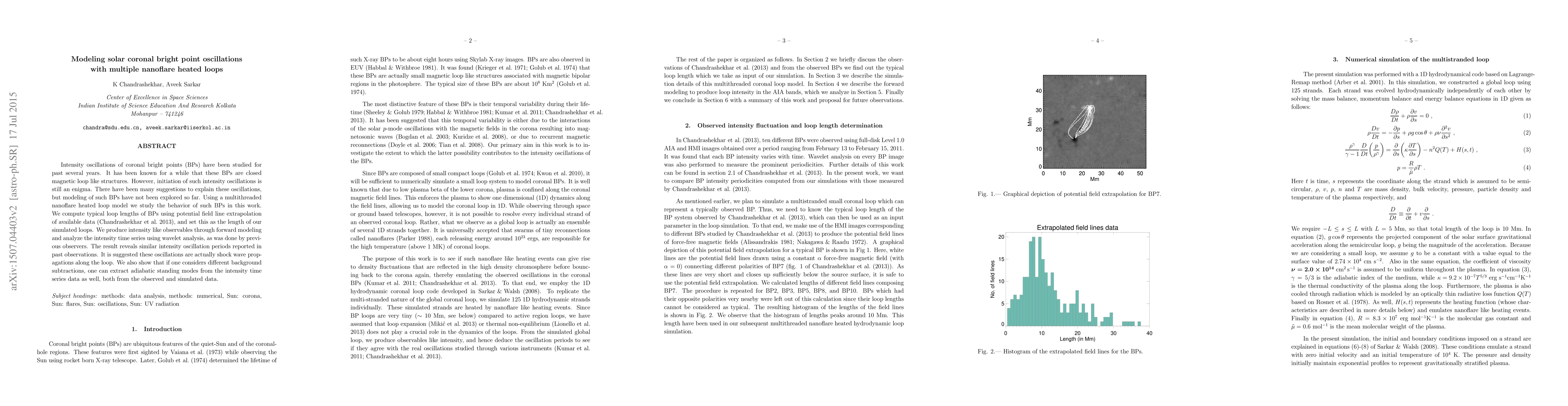 This paper models solar coronal bright point oscillations using a multithreaded nanoflare heated loop model, finding that intensity oscillations may result from shock wave propagations along the loops. The study also reveals that different background subtractions can extract adiabatic standing modes from the data.