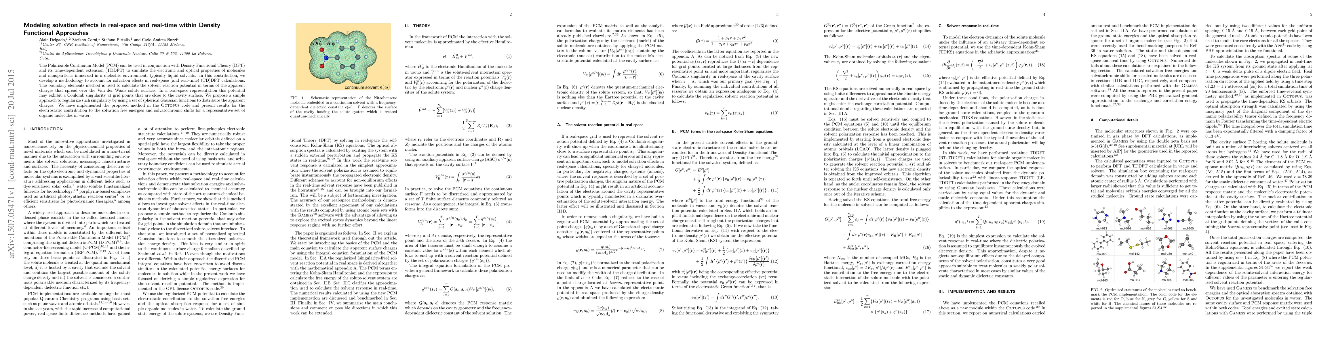 This research introduces a novel method to model solvation effects in real-space and real-time within Density Functional Theory (DFT) and its time-dependent extension (TDDFT). The approach uses the boundary elements method to calculate the solvent reaction potential, addressing Coulomb singularities near the solute surface with Gaussian functions. The method is implemented in the Octopus code and demonstrated for organic molecules in water, offering insights into solvation free energies and solvatochromic shifts.