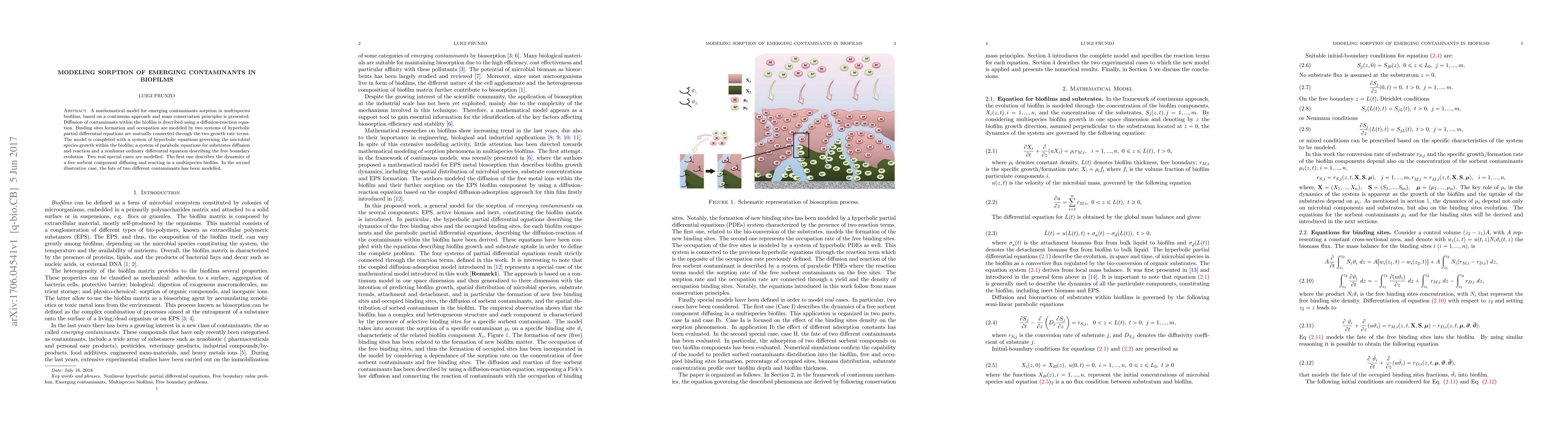 A mathematical model for emerging contaminants sorption in multispecies biofilms, based on a continuum approach and mass conservation principles is presented. Diffusion of contaminants within the biofilm is described using a diffusion-reaction equation. Binding sites formation and occupation are modeled by two systems of hyperbolic partial differential equations are mutually connected through the two growth rate terms. The model is completed with a system of hyperbolic equations governing the microbial species growth within the biofilm; a system of parabolic equations for substrates diffusion and reaction and a nonlinear ordinary differential equation describing the free boundary evolution. Two real special cases are modelled. The first one describes the dynamics of a free sorbent component diffusing and reacting in a multispecies biofilm. In the second illustrative case, the fate of two different contaminants has been modelled.