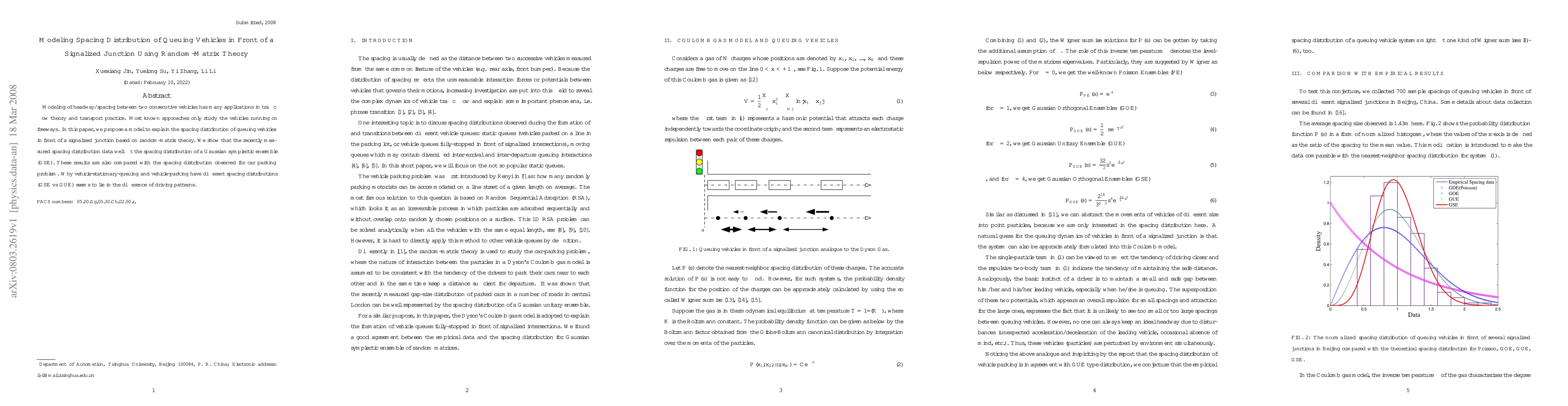 This paper proposes a novel model using random-matrix theory to analyze the spacing distribution of queuing vehicles at signalized junctions, demonstrating a good fit with Gaussian symplectic ensemble (GSE) data. It contrasts this with the Gaussian unitary ensemble (GUE) observed in car parking, attributing differences to distinct driving patterns.