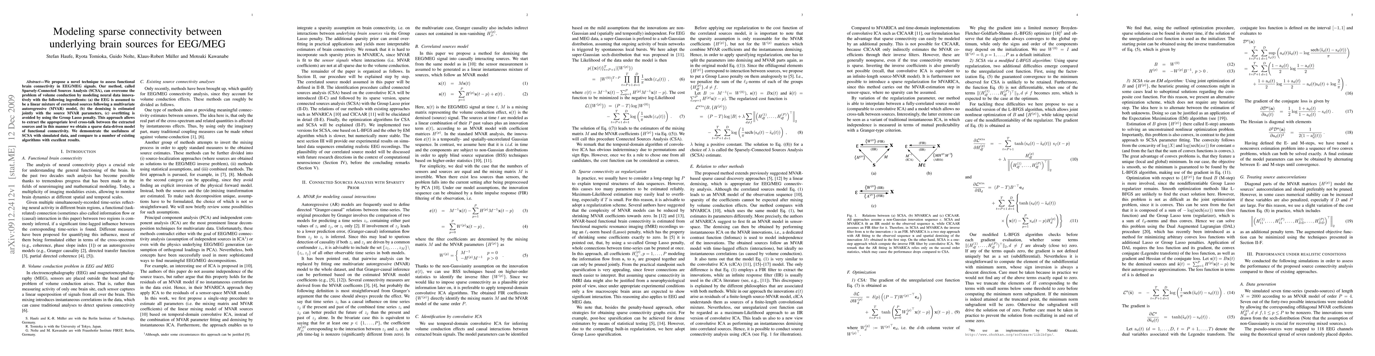 We propose a novel technique to assess functional brain connectivity in EEG/MEG signals. Our method, called Sparsely-Connected Sources Analysis (SCSA), can overcome the problem of volume conduction by modeling neural data innovatively with the following ingredients: (a) the EEG is assumed to be a linear mixture of correlated sources following a multivariate autoregressive (MVAR) model, (b) the demixing is estimated jointly with the source MVAR parameters, (c) overfitting is avoided by using the Group Lasso penalty. This approach allows to extract the appropriate level cross-talk between the extracted sources and in this manner we obtain a sparse data-driven model of functional connectivity. We demonstrate the usefulness of SCSA with simulated data, and compare to a number of existing algorithms with excellent results.