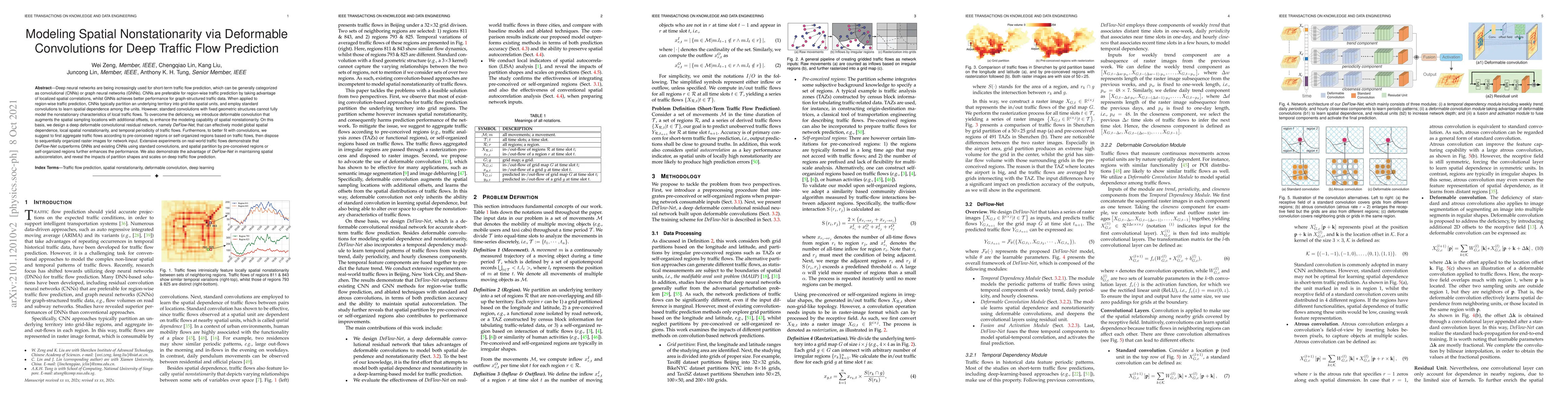 This paper proposes DeFlow-Net, a deep deformable convolutional residual network that uses deformable convolutions to model spatial nonstationarity in traffic flow prediction, outperforming both CNNs and GNNs. The method aggregates traffic flows into pre-conceived or self-organized regions before converting them into raster images for input, enhancing spatial autocorrelation and performance.
