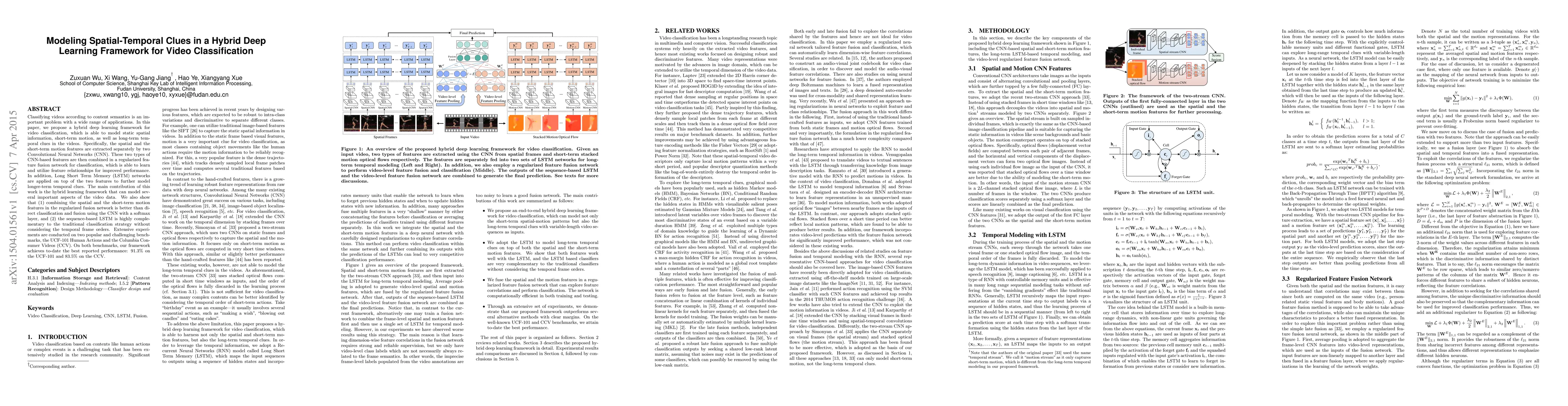 The paper proposes a hybrid deep learning framework for video classification that models static spatial information, short-term motion, and long-term temporal clues. It uses two CNNs for spatial and short-term motion feature extraction, followed by a regularized feature fusion network for classification. LSTMs are applied to model longer-term temporal clues.