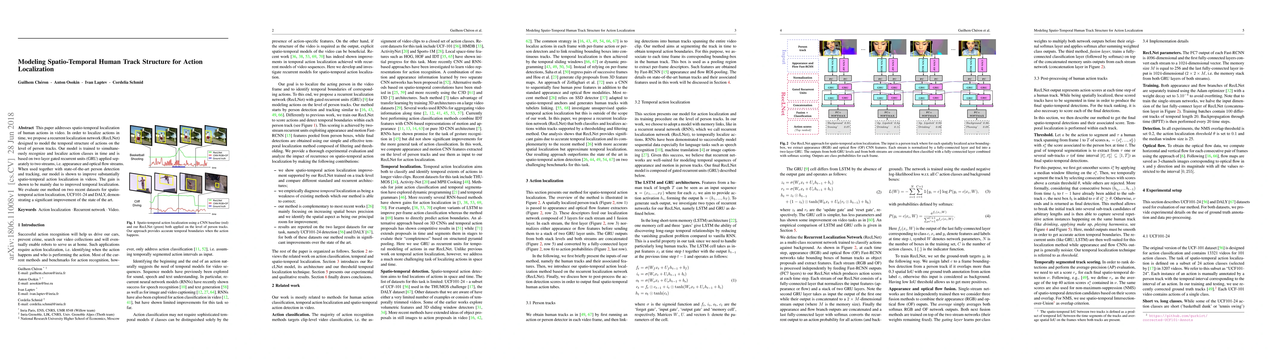 This paper proposes a recurrent localization network (RecLNet) to model the temporal structure of human actions in video, improving spatio-temporal action localization. The model combines appearance and optical flow streams using gated recurrent units (GRU) and shows significant improvement over state-of-the-art methods on UCF101-24 and DALY datasets.