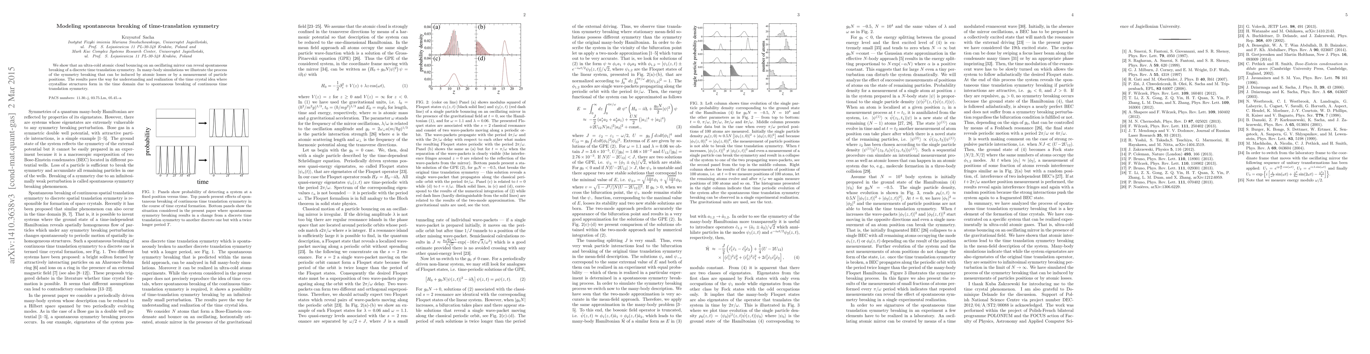 This paper demonstrates how an ultra-cold atomic cloud interacting with an oscillating mirror can exhibit spontaneous breaking of discrete time-translation symmetry, potentially leading to the realization of time crystals. Simulations show that this symmetry breaking can occur due to atomic losses or position measurements.