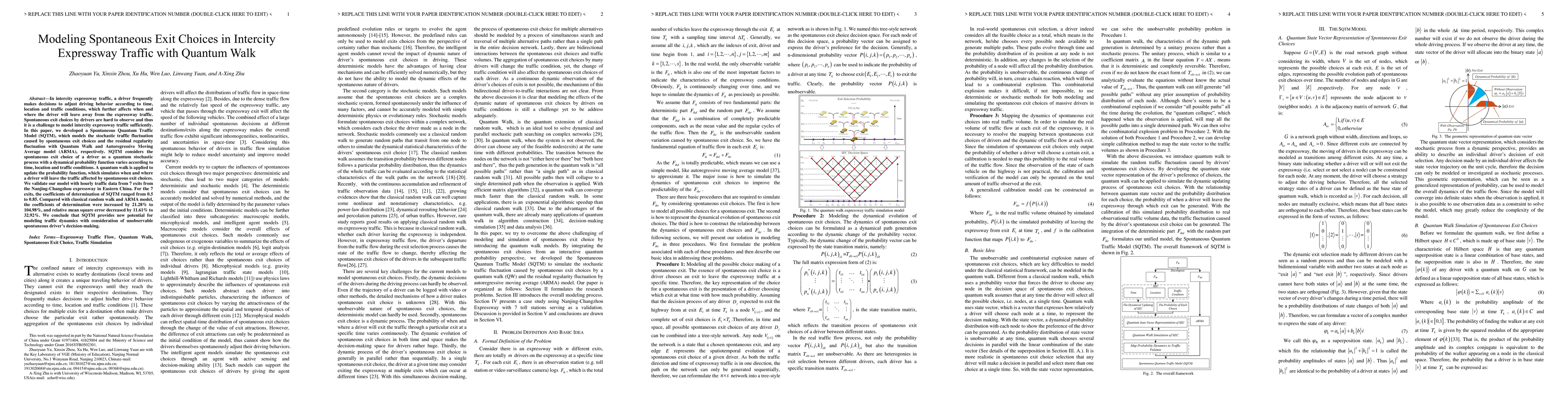 In intercity expressway traffic, a driver frequently makes decisions to adjust driving behavior according to time, location and traffic conditions, which further affects when and where the driver will leave away from the expressway traffic. Spontaneous exit choices by drivers are hard to observe and thus it is a challenge to model intercity expressway traffic sufficiently. In this paper, we developed a Spontaneous Quantum Traffic Model (SQTM), which models the stochastic traffic fluctuation caused by spontaneous exit choices and the residual regularity fluctuation with Quantum Walk and Autoregressive Moving Average model (ARMA), respectively. SQTM considers the spontaneous exit choice of a driver as a quantum stochastic process with a dynamical probability function varies according to time, location and traffic conditions. A quantum walk is applied to update the probability function, which simulates when and where a driver will leave the traffic affected by spontaneous exit choices. We validate our model with hourly traffic data from 7 exits from the Nanjing-Changzhou expressway in Eastern China. For the 7 exits, the coefficients of determination of SQTM ranged from 0.5 to 0.85. Compared with classical random walk and ARMA model, the coefficients of determination were increased by 21.28% to 104.98%, and relative mean square error decreased by 11.61% to 32.92%. We conclude that SQTM provides new potential for modeling traffic dynamics with consideration of unobservable spontaneous driver's decision-making.