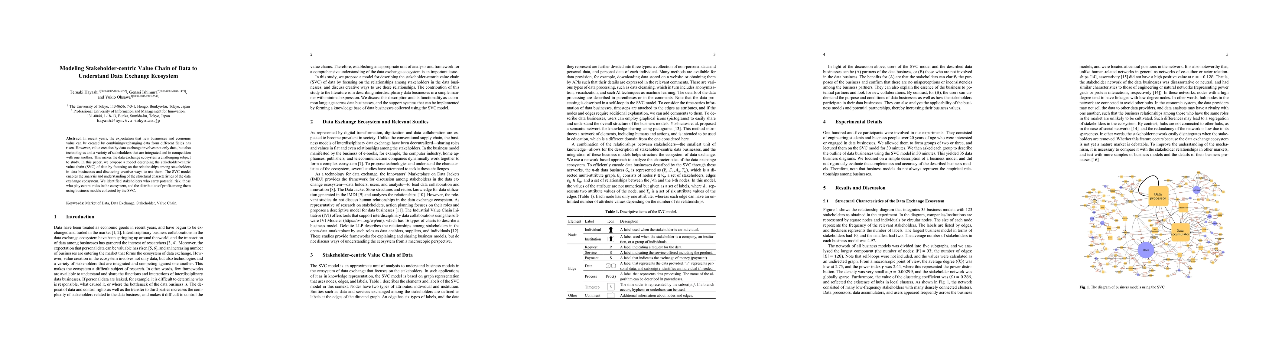In recent years, the expectation that new businesses and economic value can be created by combining/exchanging data from different fields has risen. However, value creation by data exchange involves not only data, but also technologies and a variety of stakeholders that are integrated and in competition with one another. This makes the data exchange ecosystem a challenging subject to study. In this paper, we propose a model describing the stakeholder-centric value chain (SVC) of data by focusing on the relationships among stakeholders in data businesses and discussing creative ways to use them. The SVC model enables the analysis and understanding of the structural characteristics of the data exchange ecosystem. We identified stakeholders who carry potential risk, those who play central roles in the ecosystem, and the distribution of profit among them using business models collected by the SVC.