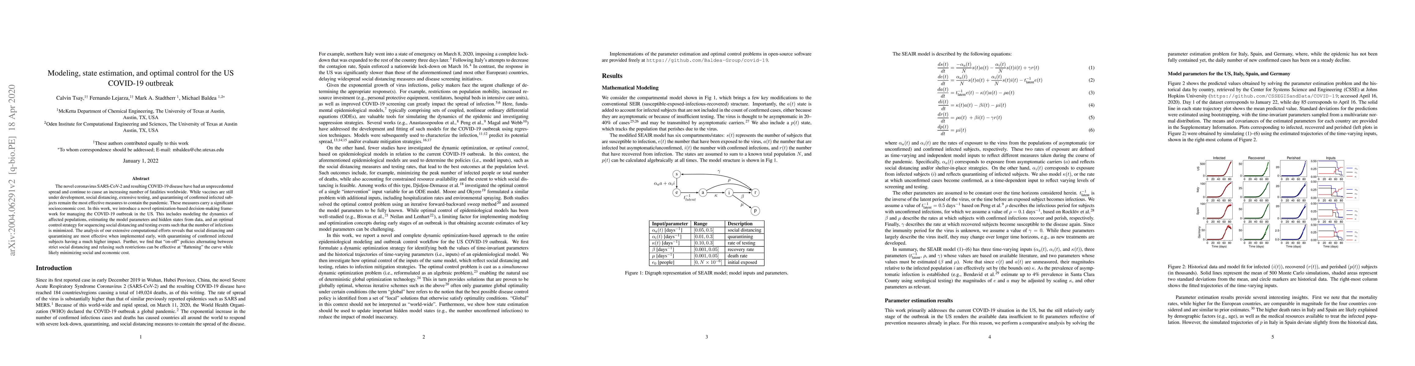 The novel coronavirus SARS-CoV-2 and resulting COVID-19 disease have had an unprecedented spread and continue to cause an increasing number of fatalities worldwide. While vaccines are still under development, social distancing, extensive testing, and quarantining of confirmed infected subjects remain the most effective measures to contain the pandemic. These measures carry a significant socioeconomic cost. In this work, we introduce a novel optimization-based decision-making framework for managing the COVID-19 outbreak in the US. This includes modeling the dynamics of affected populations, estimating the model parameters and hidden states from data, and an optimal control strategy for sequencing social distancing and testing events such that the number of infections is minimized. The analysis of our extensive computational efforts reveals that social distancing and quarantining are most effective when implemented early, with quarantining of confirmed infected subjects having a much higher impact. Further, we find that "on-off" policies alternating between strict social distancing and relaxing such restrictions can be effective at "flattening" the curve while likely minimizing social and economic cost.