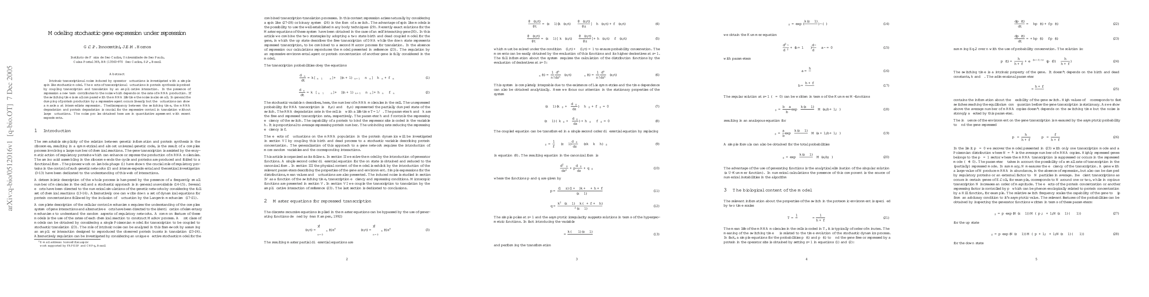 Intrinsic transcriptional noise induced by operator fluctuations is investigated with a simple spin like stochastic model. The effects of transcriptional fluctuations in protein synthesis is probed by coupling transcription and translation by an amplificative interaction. In the presence of repression a new term contributes to the noise which depends on the rate of mRNA production. If the switching time is small compared with the mRNA life time the noise is also small. In general the dumping of protein production by a repressive agent occurs linearly but the fluctuations can show a maxima at intermediate repression. The discrepancy between the switching time, the mRNA degradation and protein degradation is crucial for the repressive control in translation without large fluctuations. The noise profiles obtained here are in quantitative agreement with recent experiments.