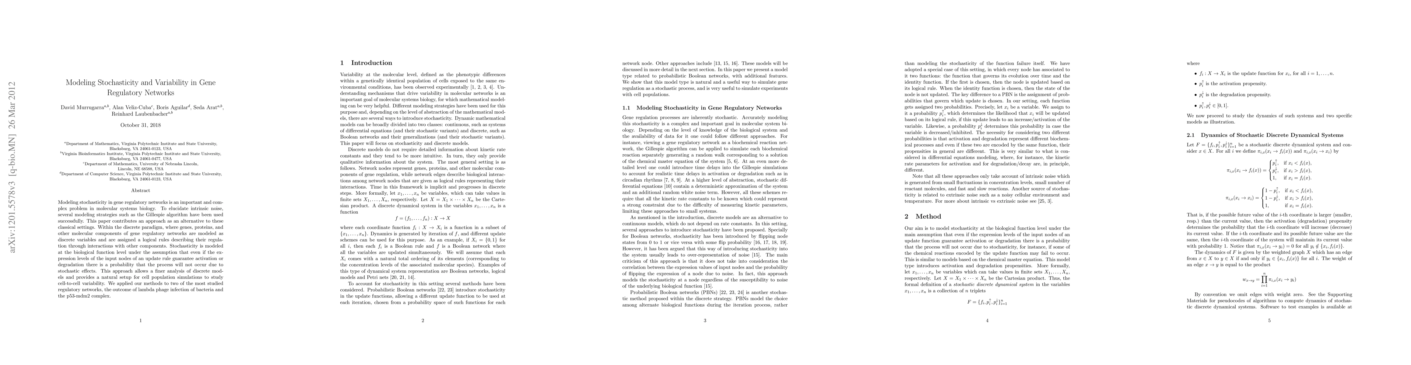 Modeling stochasticity in gene regulatory networks is an important and complex problem in molecular systems biology. To elucidate intrinsic noise, several modeling strategies such as the Gillespie algorithm have been used successfully. This paper contributes an approach as an alternative to these classical settings. Within the discrete paradigm, where genes, proteins, and other molecular components of gene regulatory networks are modeled as discrete variables and are assigned as logical rules describing their regulation through interactions with other components. Stochasticity is modeled at the biological function level under the assumption that even if the expression levels of the input nodes of an update rule guarantee activation or degradation there is a probability that the process will not occur due to stochastic effects. This approach allows a finer analysis of discrete models and provides a natural setup for cell population simulations to study cell-to-cell variability. We applied our methods to two of the most studied regulatory networks, the outcome of lambda phage infection of bacteria and the p53-mdm2 complex.