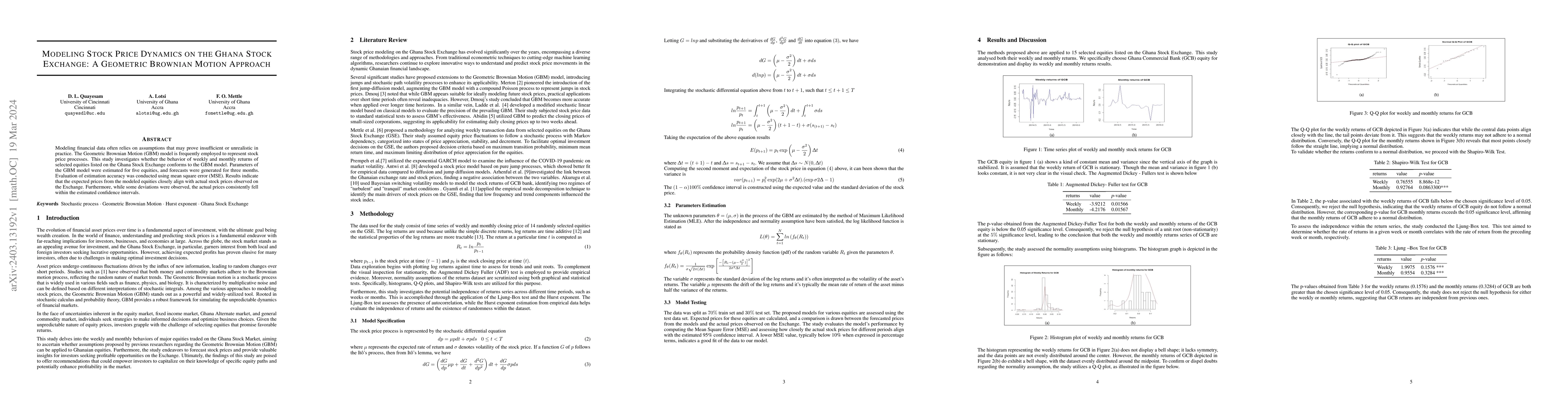 This study applies the Geometric Brownian Motion (GBM) model to analyze the stock price dynamics of five equities on the Ghana Stock Exchange. Results show that the GBM model provides accurate forecasts and actual prices fall within the estimated confidence intervals, indicating the model's effectiveness.