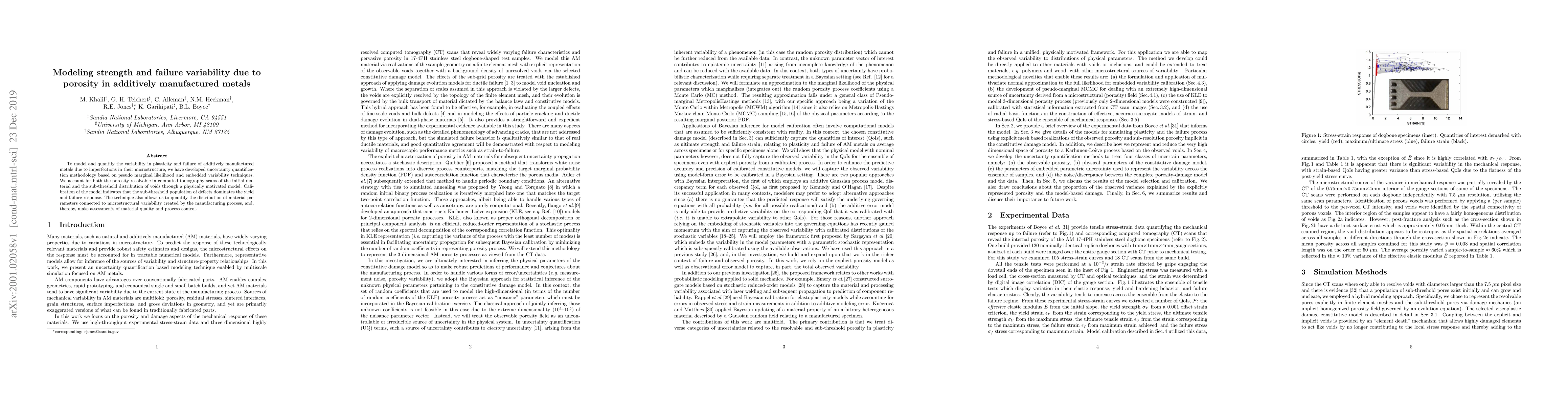 This paper develops a methodology to quantify variability in the strength and failure of additively manufactured metals due to porosity, using pseudo marginal likelihood and embedded variability techniques. The model accounts for both resolvable and sub-threshold porosity, showing that sub-threshold defects dominate yield and failure, and enables assessments of material quality and process control.