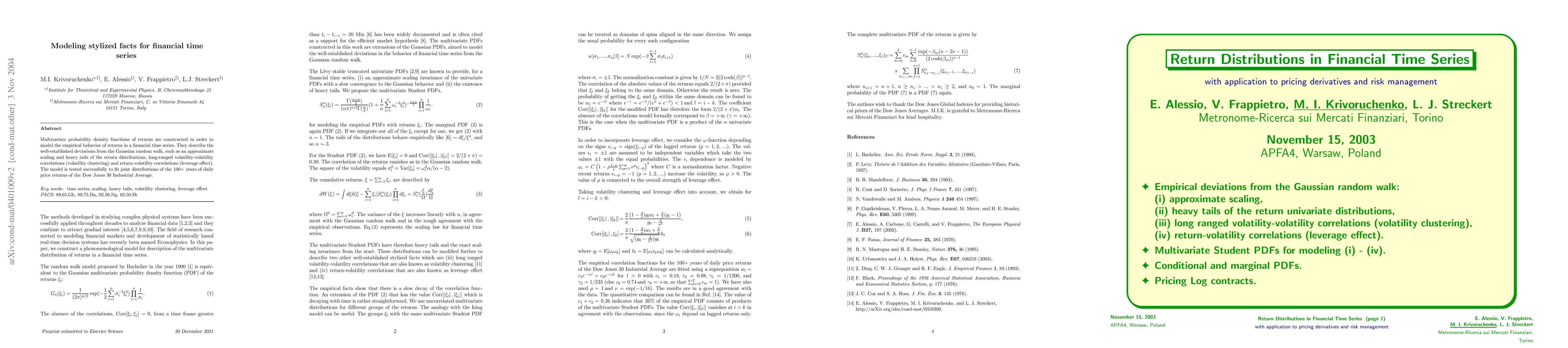This paper constructs multivariate probability density functions to model financial time series returns, capturing deviations from Gaussian behavior, including heavy tails, volatility clustering, and leverage effects. The model successfully fits the joint distributions of Dow Jones 30 Industrial Average returns over 100+ years.