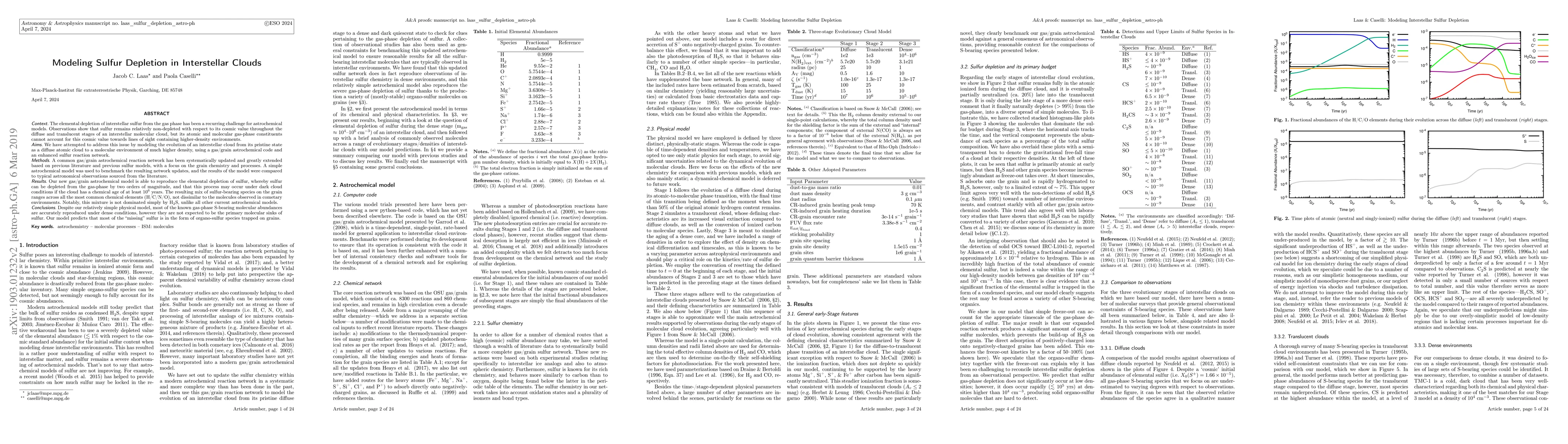 Researchers modeled sulfur depletion in interstellar clouds, finding that sulfur can be depleted from gas-phase by two orders of magnitude under dark cloud conditions, with most missing sulfur trapped on grains as organo-sulfur species.