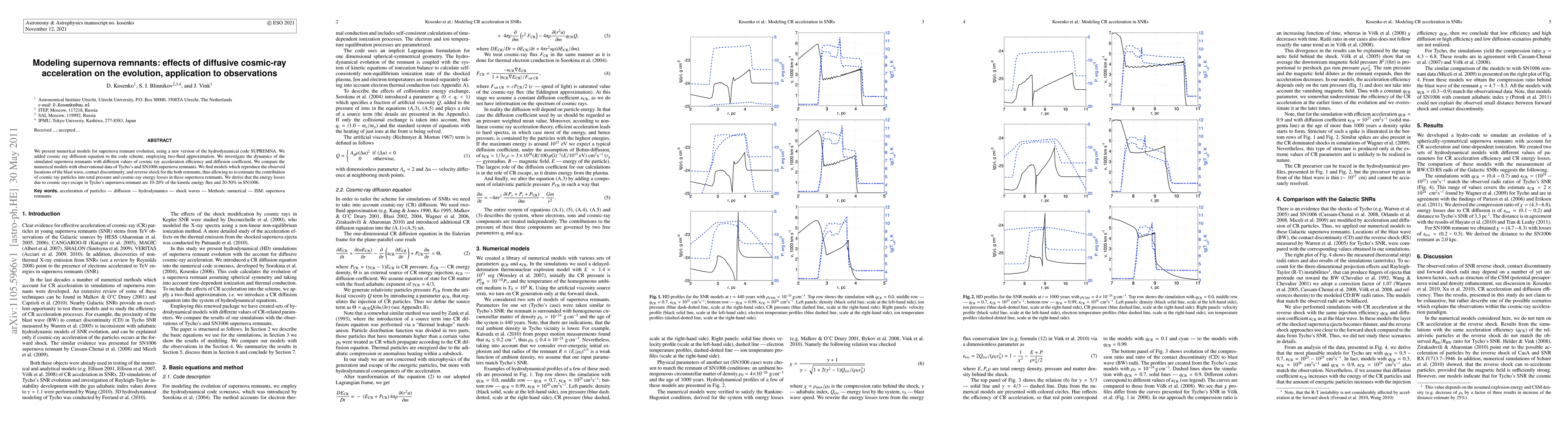This paper models supernova remnant evolution using a new hydrodynamical code that incorporates cosmic ray diffusion, comparing simulations to observations of Tycho's and SN1006 remnants. The study estimates cosmic ray contributions to pressure and energy losses, finding that in Tycho's remnant, cosmic ray energy losses are 10-20% of the kinetic energy flux, while in SN1006, they are 20-50%.