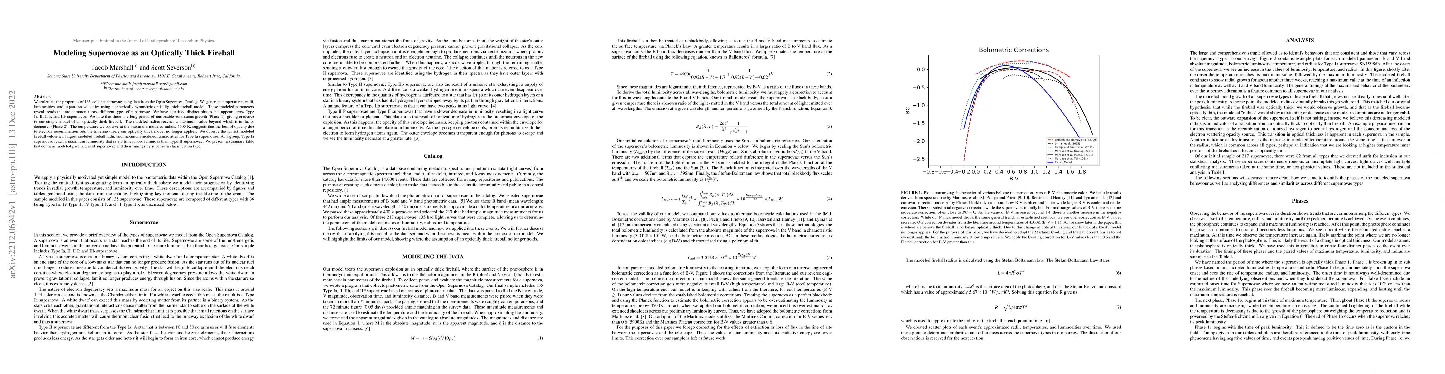 This paper models 135 supernovae using an optically thick fireball model, identifying common trends and distinct phases across different types. Type Ia supernovae exhibit the highest luminosities and fastest expansion velocities, while the model's applicability ends at 4500 K due to electron recombination.