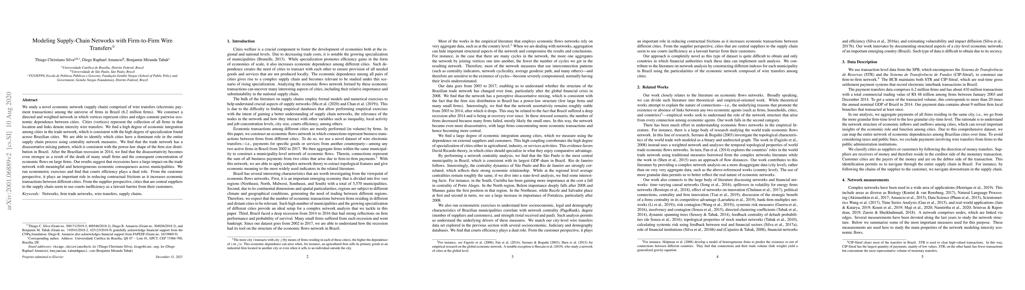 We study a novel economic network (supply chain) comprised of wire transfers (electronic payment transactions) among the universe of firms in Brazil (6.2 million firms). We construct a directed and weighted network in which vertices represent cities and edges connote pairwise economic dependence between cities. Cities (vertices) represent the collection of all firms in that location and links denote intercity wire transfers. We find a high degree of economic integration among cities in the trade network, which is consistent with the high degree of specialization found across Brazilian cities. We are able to identify which cities have a dominant role in the entire supply chain process using centrality network measures. We find that the trade network has a disassortative mixing pattern, which is consistent with the power-law shape of the firm size distribution in Brazil. After the Brazilian recession in 2014, we find that the disassortativity becomes even stronger as a result of the death of many small firms and the consequent concentration of economic flows on large firms. Our results suggest that recessions have a large impact on the trade network with meaningful and heterogeneous economic consequences across municipalities. We run econometric exercises and find that courts efficiency plays a dual role. From the customer perspective, it plays an important role in reducing contractual frictions as it increases economic transactions between different cities. From the supplier perspective, cities that are central suppliers to the supply chain seem to use courts inefficiency as a lawsuit barrier from their customers.
