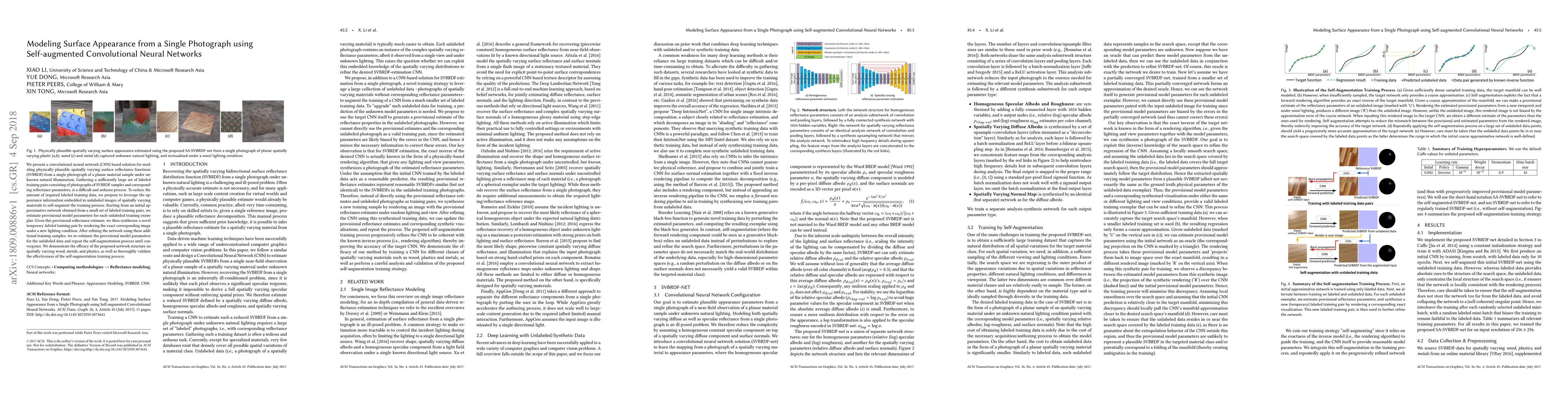 A self-augmented convolutional neural network is proposed to model surface appearance from a single photograph of a material sample under unknown natural illumination, reducing the need for large labeled training data.