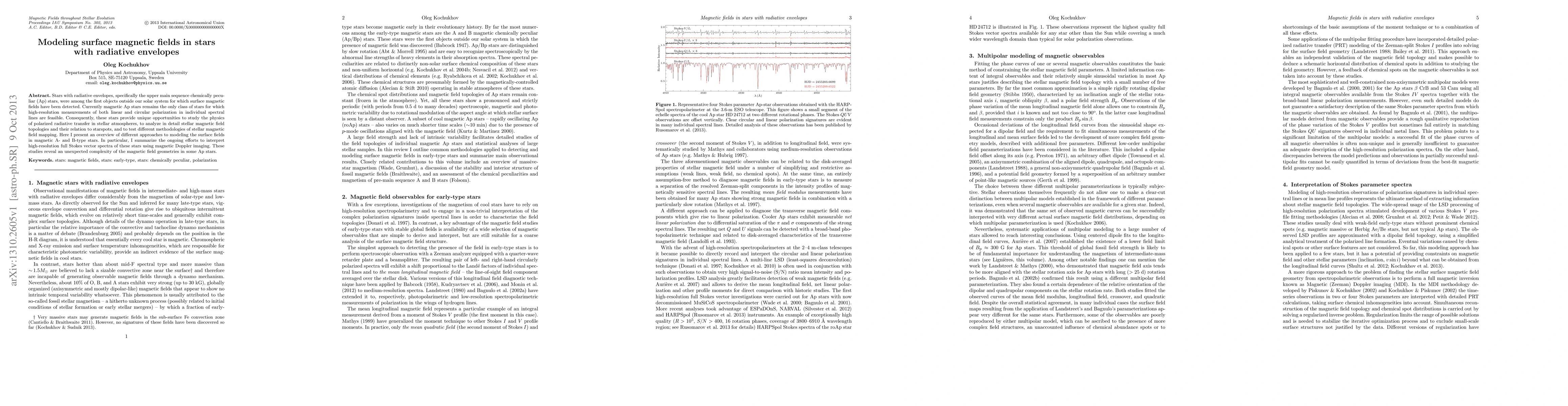 Stars with radiative envelopes, specifically the upper main sequence chemically peculiar (Ap) stars, were among the first objects outside our solar system for which surface magnetic fields have been detected. Currently magnetic Ap stars remains the only class of stars for which high-resolution measurements of both linear and circular polarization in individual spectral lines are feasible. Consequently, these stars provide unique opportunities to study the physics of polarized radiative transfer in stellar atmospheres, to analyze in detail stellar magnetic field topologies and their relation to starspots, and to test different methodologies of stellar magnetic field mapping. Here I present an overview of different approaches to modeling the surface fields in magnetic A- and B-type stars. In particular, I summarize the ongoing efforts to interpret high-resolution full Stokes vector spectra of these stars using magnetic Doppler imaging. These studies reveal an unexpected complexity of the magnetic field geometries in some Ap stars.