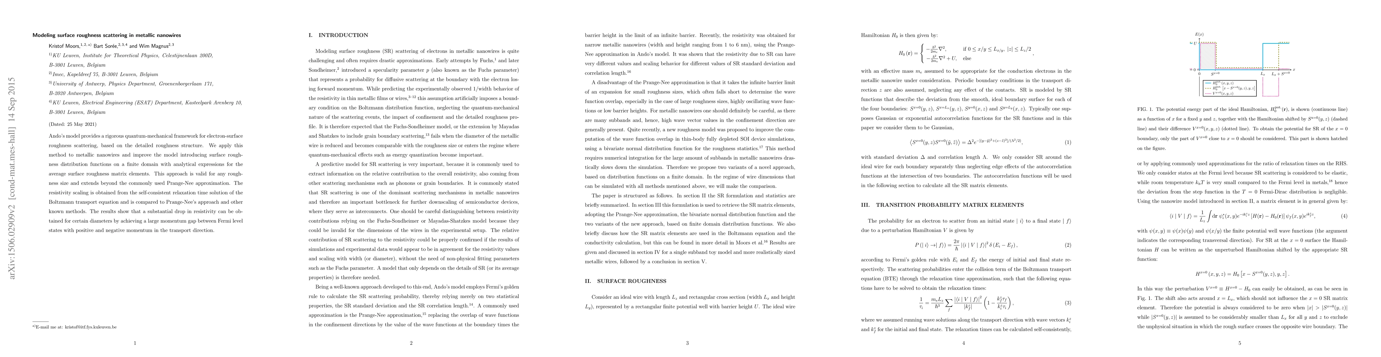 The research improves Ando's model for electron-surface roughness scattering in metallic nanowires by introducing surface roughness distribution functions on a finite domain with analytical expressions for average surface roughness matrix elements, extending beyond the Prange-Nee approximation.