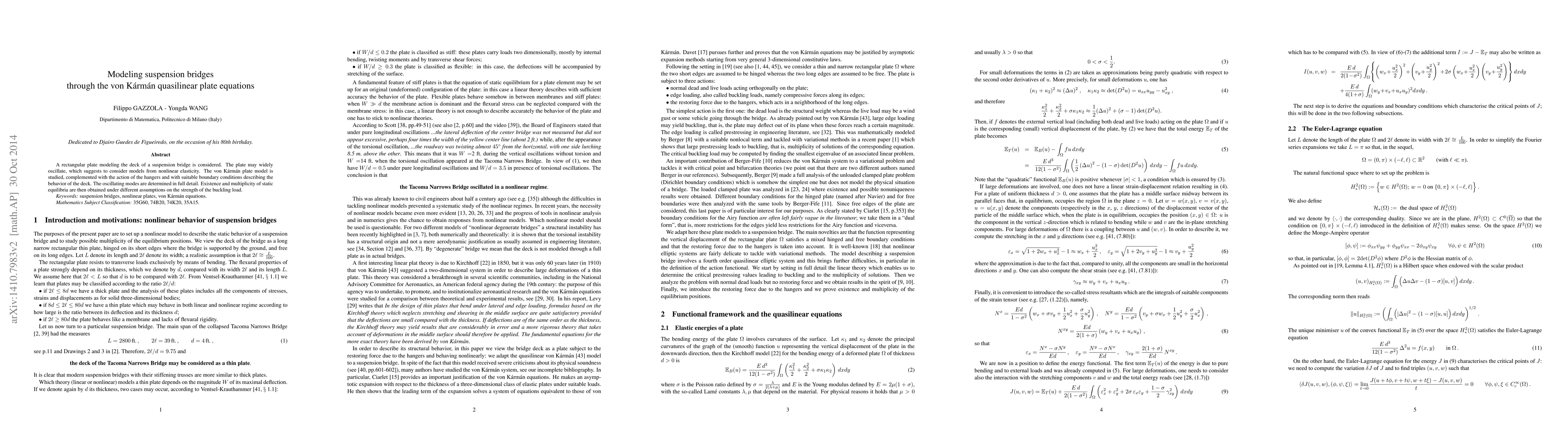 This paper models the deck of a suspension bridge using the von Kármán quasilinear plate equations, incorporating the effects of hangers and boundary conditions. It investigates the oscillatory modes and explores the existence and multiplicity of static equilibria under varying buckling load conditions.