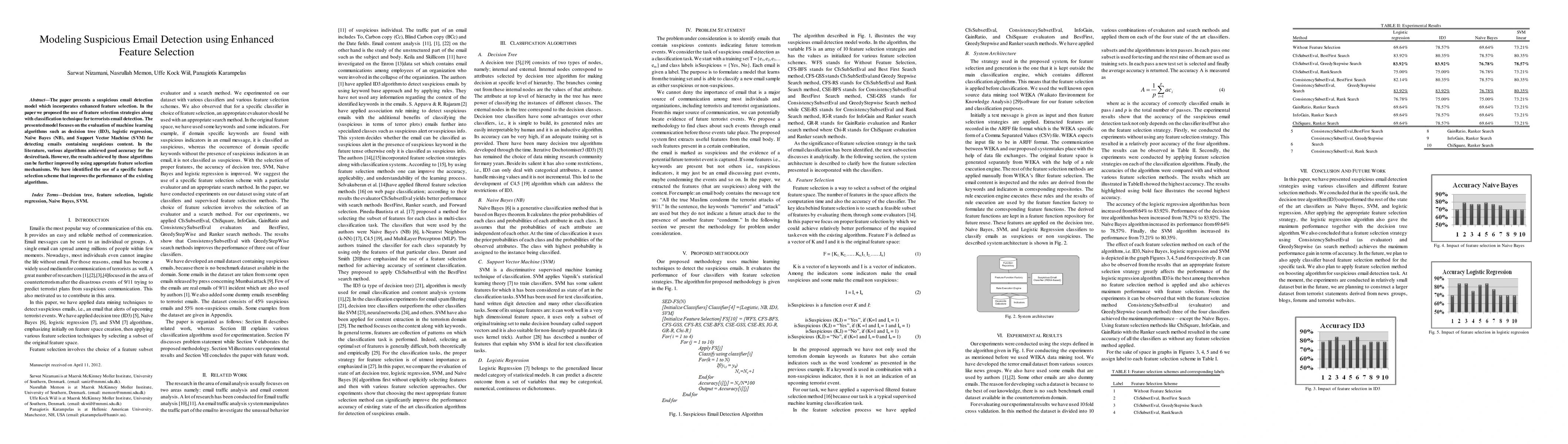 This paper proposes a suspicious email detection model using enhanced feature selection to improve the accuracy of machine learning algorithms like ID3, logistic regression, Naive Bayes, and SVM. The study identifies a specific feature selection scheme that boosts the performance of these algorithms in detecting terrorist-related emails.
