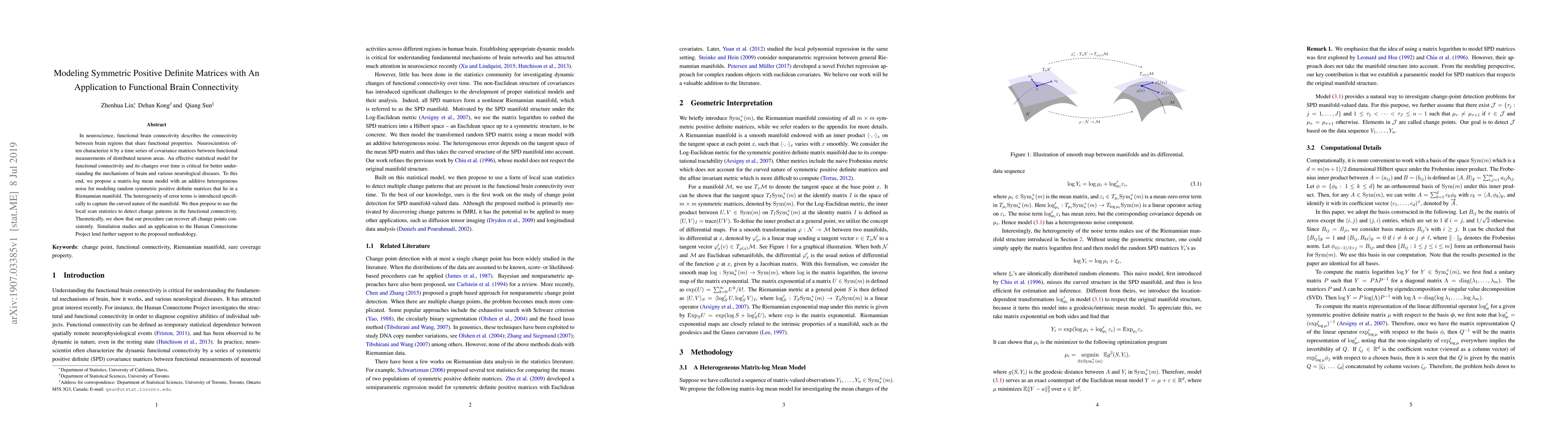 In neuroscience, functional brain connectivity describes the connectivity between brain regions that share functional properties. Neuroscientists often characterize it by a time series of covariance matrices between functional measurements of distributed neuron areas. An effective statistical model for functional connectivity and its changes over time is critical for better understanding the mechanisms of brain and various neurological diseases. To this end, we propose a matrix-log mean model with an additive heterogeneous noise for modeling random symmetric positive definite matrices that lie in a Riemannian manifold. The heterogeneity of error terms is introduced specifically to capture the curved nature of the manifold. We then propose to use the local scan statistics to detect change patterns in the functional connectivity. Theoretically, we show that our procedure can recover all change points consistently. Simulation studies and an application to the Human Connectome Project lend further support to the proposed methodology.