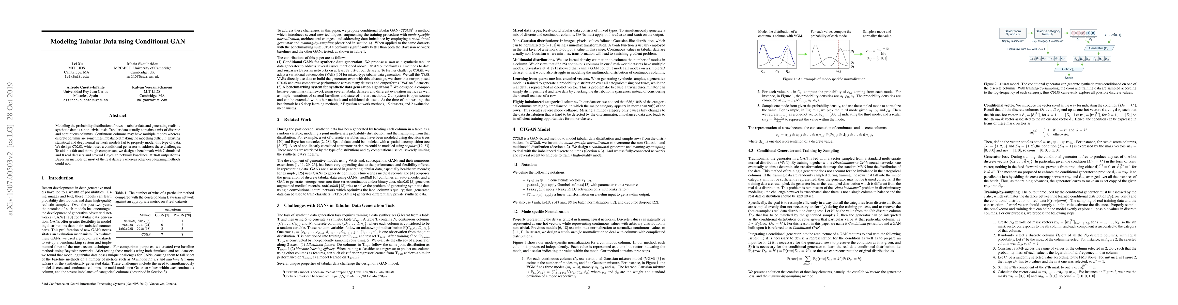 The paper proposes TGAN, a conditional generative adversarial network for modeling tabular data with mixed discrete and continuous columns. TGAN outperforms Bayesian baselines and other deep learning methods on a benchmark of simulated and real datasets.