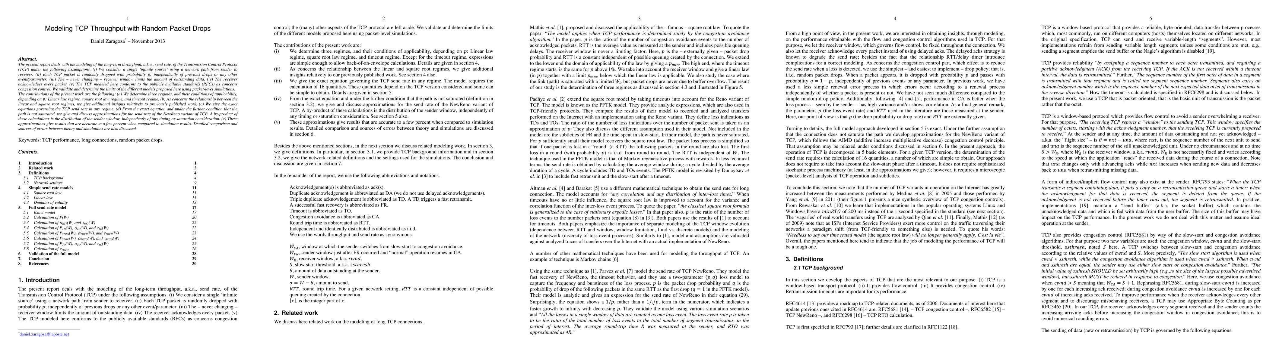 The present report deals with the modeling of the long-term throughput, a.k.a., send rate, of the Transmission Control Protocol (TCP) under the following assumptions. (i) We consider a single 'infinite source' using a network path from sender to receiver. (ii) Each TCP packet is randomly dropped with probability p; independently of previous drops or any other event/parameter. (iii) The - never changing - receiver window limits the amount of outstanding data. (iv) The receiver acknowledges every packet. (v) The TCP modeled here conforms to the publicly available standards (RFCs) as concerns congestion control. We validate and determine the limits of the different models proposed here using packet-level simulations. The contributions of the present work are the following: (a) We determine three regimes, and their conditions of applicability, depending on p: Linear law regime, square root law regime, and timeout regime. (b) As concerns the relationship between the linear and square root regimes, we give additional insights relatively to previously published work. (c) We give the exact equations governing the TCP send rate in any regime. (d) From the exact equation and under the further condition that the path is not saturated, we give and discuss approximations for the send rate of the NewReno variant of TCP. A by-product of these calculations is the distribution of the sender window, independently of any timing or saturation consideration. (e) These approximations give results that are accurate to a few percent when compared to simulation results. Detailed comparison and sources of errors between theory and simulations are also discussed.