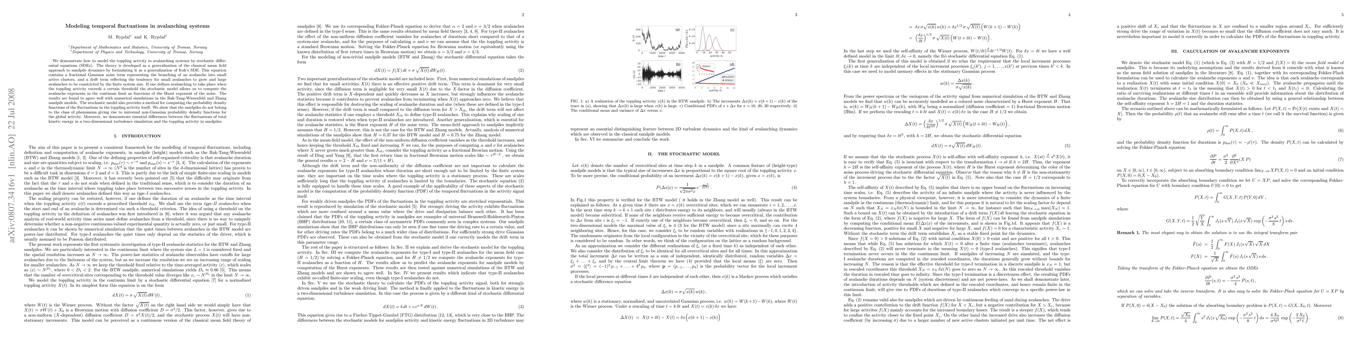 We demonstrate how to model the toppling activity in avalanching systems by stochastic differential equations (SDEs). The theory is developed as a generalization of the classical mean field approach to sandpile dynamics by formulating it as a generalization of Itoh's SDE. This equation contains a fractional Gaussian noise term representing the branching of an avalanche into small active clusters, and a drift term reflecting the tendency for small avalanches to grow and large avalanches to be constricted by the finite system size. If one defines avalanching to take place when the toppling activity exceeds a certain threshold the stochastic model allows us to compute the avalanche exponents in the continum limit as functions of the Hurst exponent of the noise. The results are found to agree well with numerical simulations in the Bak-Tang-Wiesenfeld and Zhang sandpile models. The stochastic model also provides a method for computing the probability density functions of the fluctuations in the toppling activity itself. We show that the sandpiles do not belong to the class of phenomena giving rise to universal non-Gaussian probability density functions for the global activity. Moreover, we demonstrate essential differences between the fluctuations of total kinetic energy in a two-dimensional turbulence simulation and the toppling activity in sandpiles.