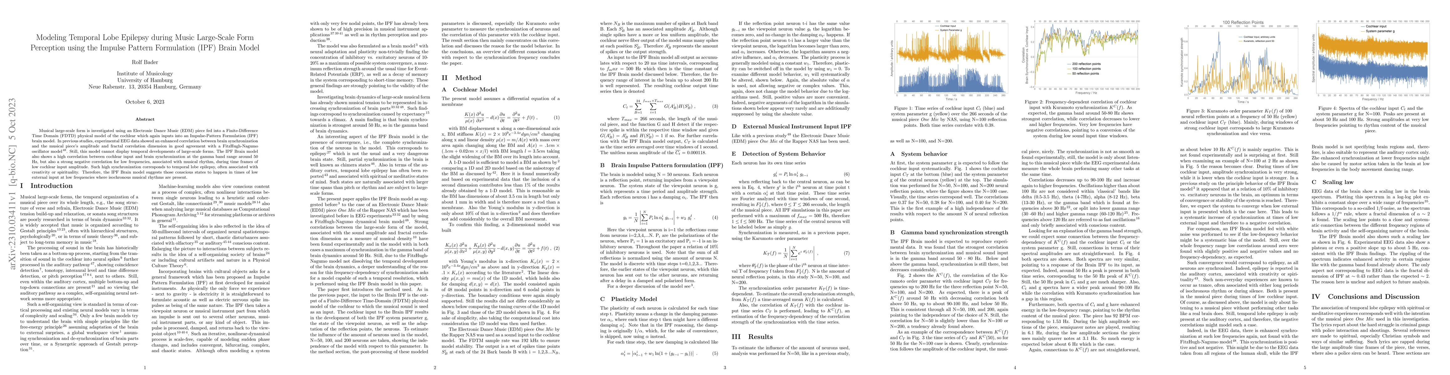 This study uses an Impulse Pattern Formulation (IPF) brain model to explore the relationship between musical large-scale form perception and temporal lobe epilepsy, demonstrating high brain synchronization in gamma band activity during low-frequency rhythm perception, suggesting such synchronization may coincide with temporal lobe epilepsy episodes.