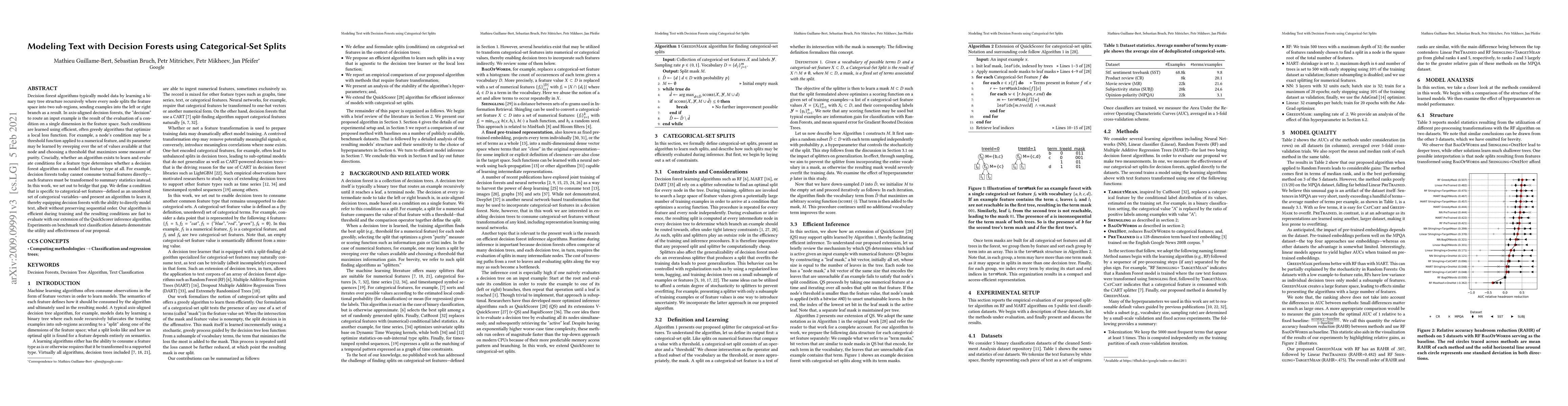 This paper introduces a novel condition for categorical-set splits to enable decision forests to model text directly, overcoming the limitation of current methods that require transforming text into summary statistics. The proposed algorithm efficiently learns and evaluates these conditions, enhancing the performance of decision forests on text classification tasks.