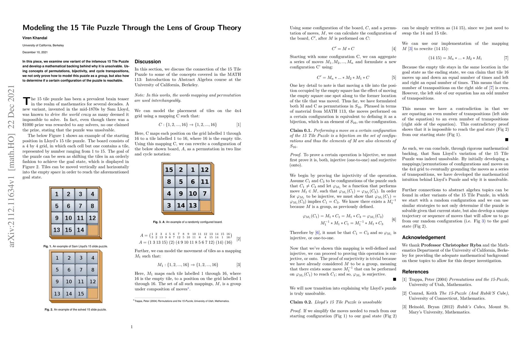 In this piece, we examine one variant of the infamous 15 Tile Puzzle and develop a mathematical backing behind why it is unsolvable. Using concepts of permutations, bijectivity, and cycle transpositions, we not only prove how to model this puzzle as a group but also how to determine if a certain configuration of the puzzle is reachable.