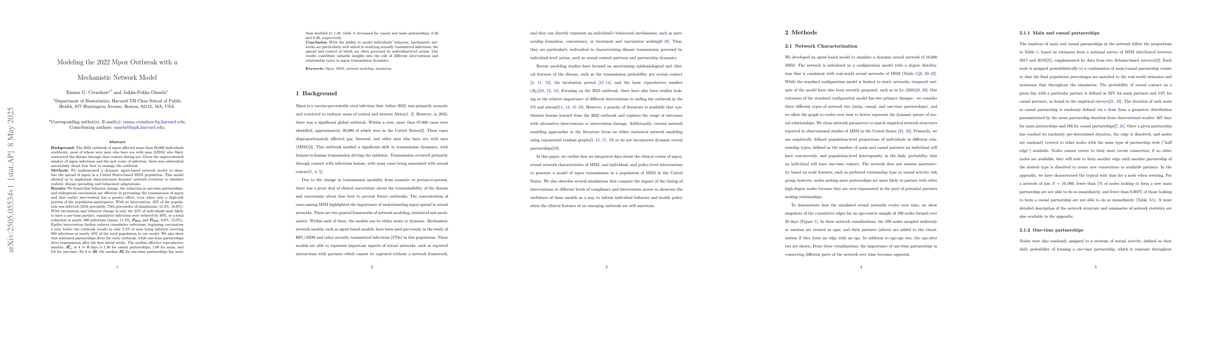 A modeling study found that interventions like vaccination and behavior change can reduce mpox transmission by 30-50%, with earlier intervention having a greater effect. Sustained partnerships drive early outbreaks, while one-time partnerships drive later transmissions.