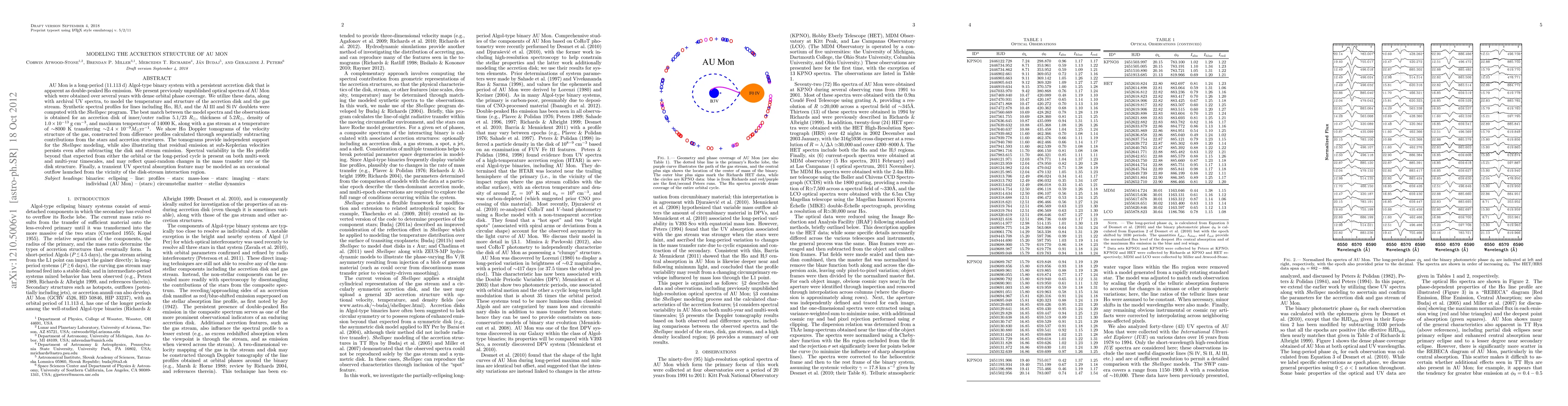 AU Mon is a long-period (11.113 d) Algol-type binary system with a persistent accretion disk that is apparent as double-peaked H-alpha emission. We present previously unpublished optical spectra of AU Mon which were obtained over several years with dense orbital phase coverage. We utilize these data, along with archival UV spectra, to model the temperature and structure of the accretion disk and the gas stream. Synthetic spectral profiles for lines including H-alpha, H-beta, and the Al III and Si IV doublets were computed with the Shellspec program. The best match between the model spectra and the observations is obtained for an accretion disk of inner/outer radius 5.1/23 R_sun, thickness of 5.2 R_sun, density of 1.0e-13 g/cm^3, and maximum temperature of 14000 K, along with a gas stream at a temperature of ~8000 K transferring ~2.4e-9 M_sun/yr. We show H-alpha Doppler tomograms of the velocity structure of the gas, constructed from difference profiles calculated through sequentially subtracting contributions from the stars and accretion structures. The tomograms provide independent support for the Shellspec modeling, while also illustrating that residual emission at sub-Keplerian velocities persists even after subtracting the disk and stream emission. Spectral variability in the H-alpha profile beyond that expected from either the orbital or the long-period cycle is present on both multi-week and multi-year timescales, and may reflect quasi-random changes in the mass transfer rate or the disk structure. Finally, a transient UV spectral absorption feature may be modeled as an occasional outflow launched from the vicinity of the disk-stream interaction region.