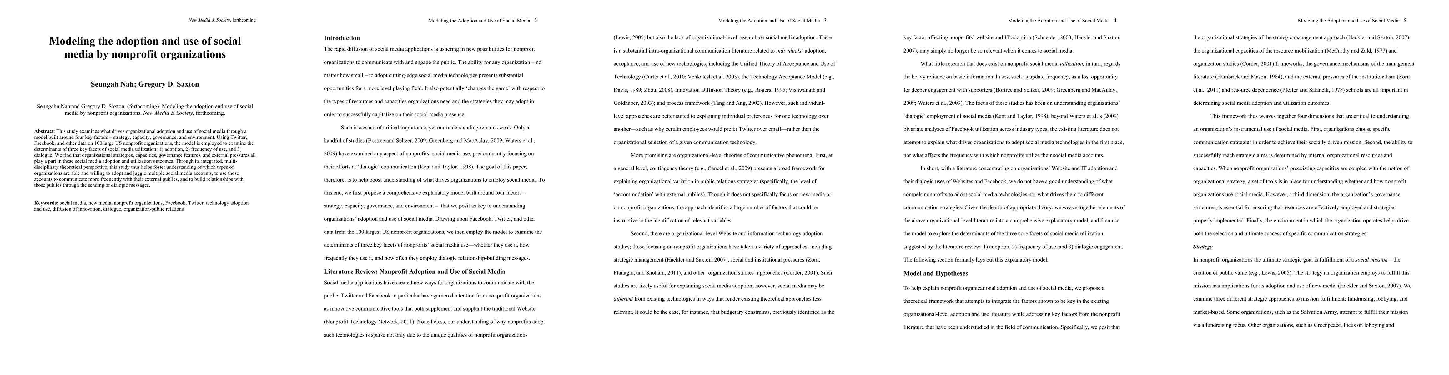 This study models the adoption and use of social media by large US nonprofit organizations, identifying strategy, capacity, governance, and environment as key drivers. It finds that these factors influence adoption, frequency of use, and dialogic communication, enhancing understanding of organizational social media engagement.