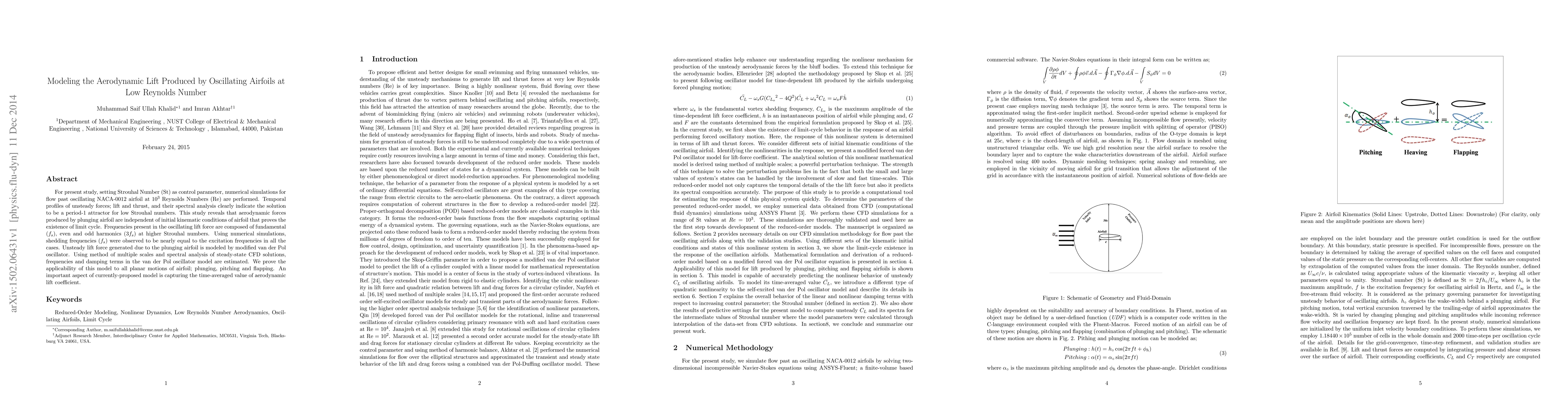 This study numerically models the aerodynamic lift generated by oscillating NACA-0012 airfoils at low Reynolds numbers, revealing a period-1 attractor for low Strouhal numbers and independence of initial kinematic conditions. The lift force is modeled using a modified van der Pol oscillator, capturing fundamental and harmonic frequencies, and validated for various airfoil motions.