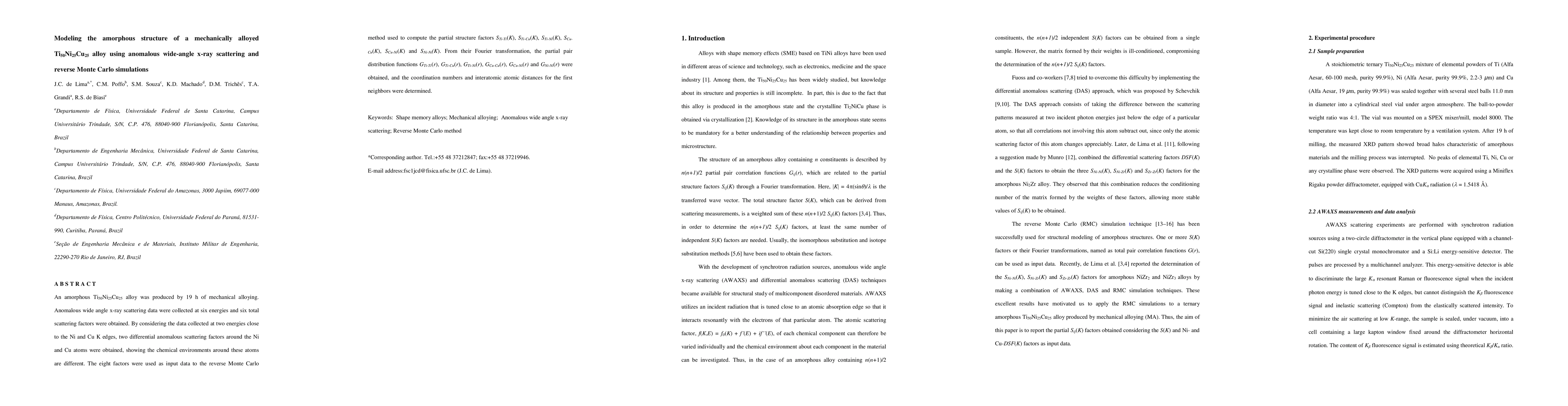 This study models the amorphous structure of a Ti50Ni25Cu25 alloy produced via mechanical alloying using anomalous wide-angle x-ray scattering and reverse Monte Carlo simulations, revealing distinct chemical environments around Ni and Cu atoms and determining coordination numbers and interatomic distances.