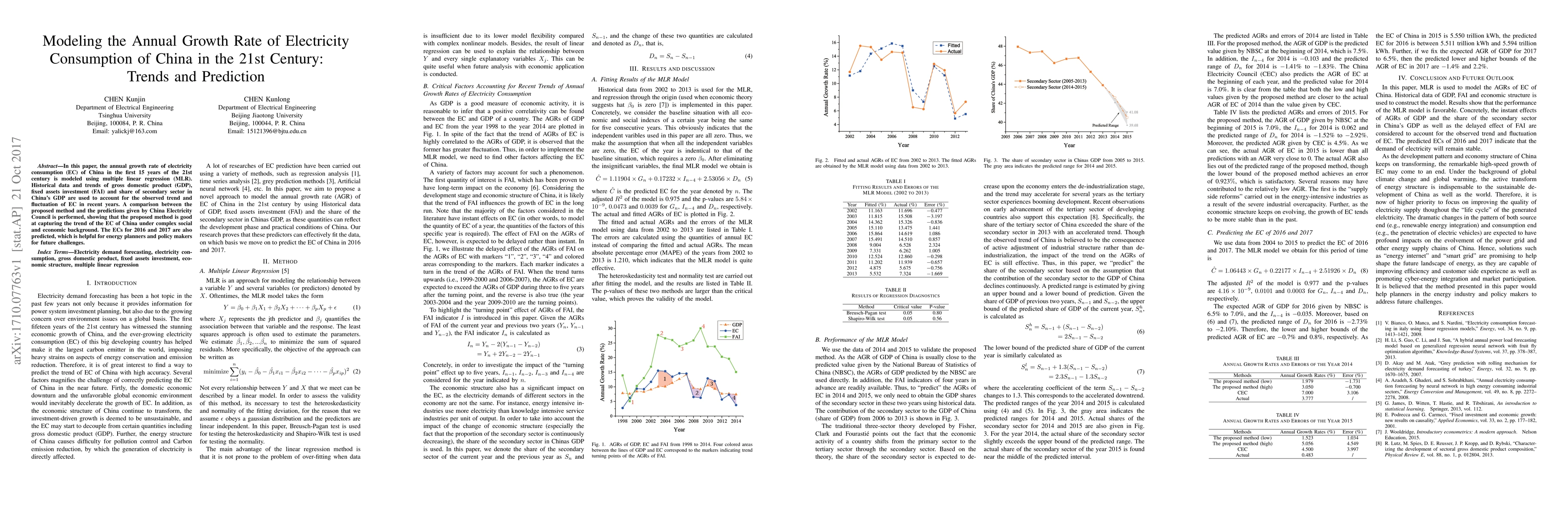 This paper models China's annual electricity consumption growth rate using multiple linear regression, incorporating GDP, fixed assets investment, and the secondary sector's share. It compares its predictions with the China Electricity Council's forecasts, showing superior trend capture, and predicts electricity consumption for 2016 and 2017 to aid energy planners.