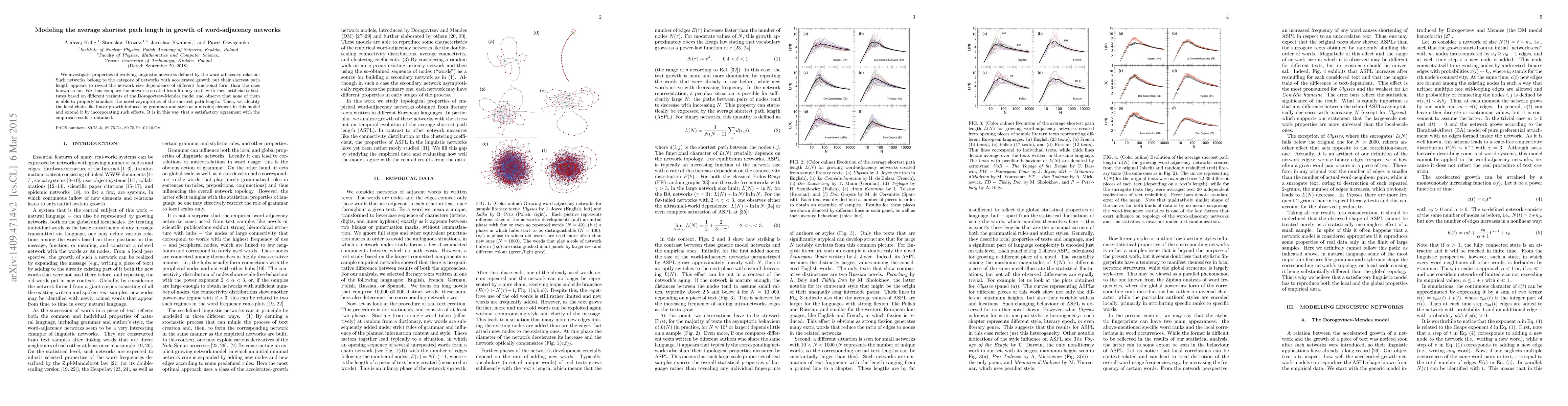 This paper examines evolving linguistic networks based on word-adjacency relations, finding that their average shortest path length does not follow known growth-dependent patterns. It extends the Dorogovtsev-Mendes model by incorporating local chain-like linear growth to better simulate the observed network behavior.