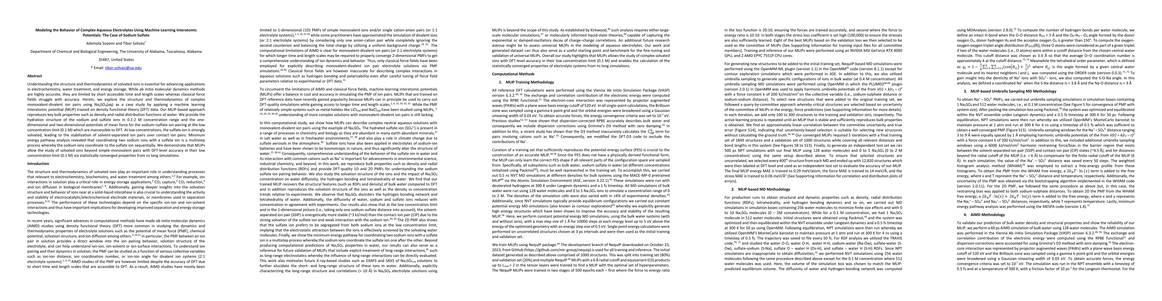 Understanding the structure and thermodynamics of solvated ions is essential for advancing applications in electrochemistry, water treatment, and energy storage. While ab initio molecular dynamics methods are highly accurate, they are limited by short accessible time and length scales whereas classical force fields struggle with accuracy. Herein, we explore the structure and thermodynamics of complex monovalent-divalent ion pairs using Na2SO4(aq) as a case study by applying a machine learning interatomic potential (MLIP) trained on density functional theory (DFT) data. Our MLIP-based approach reproduces key bulk properties such as density and radial distribution functions of water. We provide the hydration structure of the sodium and sulfate ions in 0.1-2 M concentration range and the one-dimensional and two-dimensional potentials of mean force for the sodium-sulfate ion pairing at the low concentration limit (0.1 M) which are inaccessible to DFT. At low concentrations, the sulfate ion is strongly solvated, leading to the stabilization of solvent-separated ion pairs over contact ion pairs. Minimum energy pathway analysis revealed that coordinating two sodium ions with a sulfate ion is a multistep process whereby the sodium ions coordinate to the sulfate ion sequentially. We demonstrate that MLIPs allow the study of solvated ions beyond simple monovalent pairs with DFT-level accuracy in their low concentration limit (0.1 M) via statistically converged properties from ns long simulations.