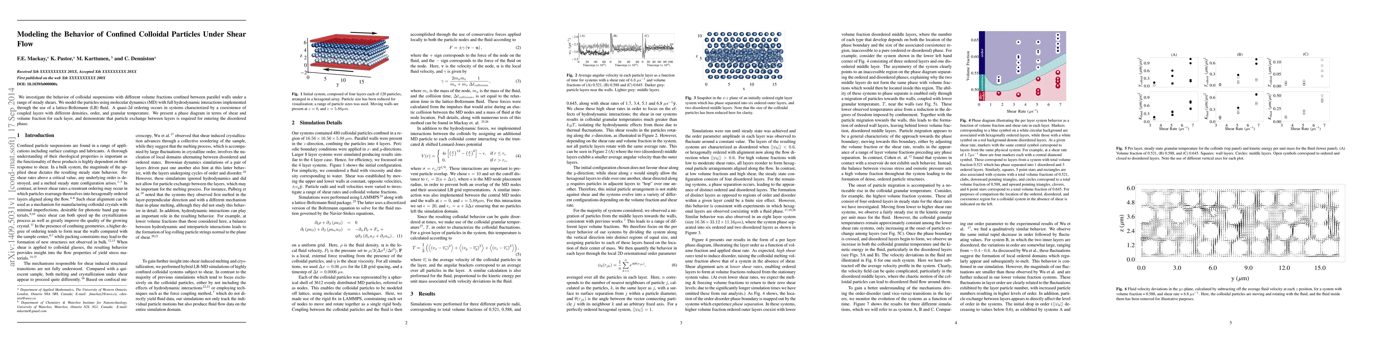 This study models the behavior of colloidal particles under shear flow using molecular dynamics and lattice-Boltzmann methods, revealing quasi-2D ordering and a phase diagram showing the conditions for layer coexistence and particle exchange leading to disorder.